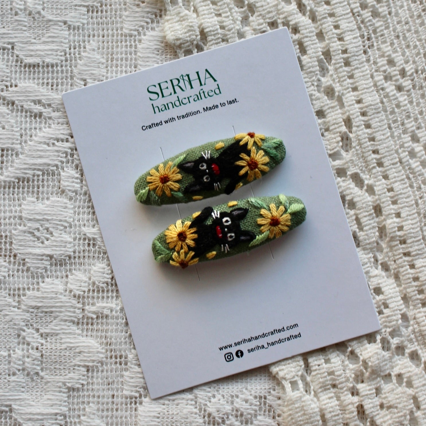 Our sweet embroidered design is inspired from Ghibli's character Totoro and makes this hairpin a unique addition to your style. The hairpin is expertly handcrafted from recycled natural materials, and each piece is unique – the materials have been given a new lease of life in this charming accessory. The sophisticated embroidery stitches and natural tones create a durable and charming ensemble. The perfect gift for anyone who values both personal style and the environment.