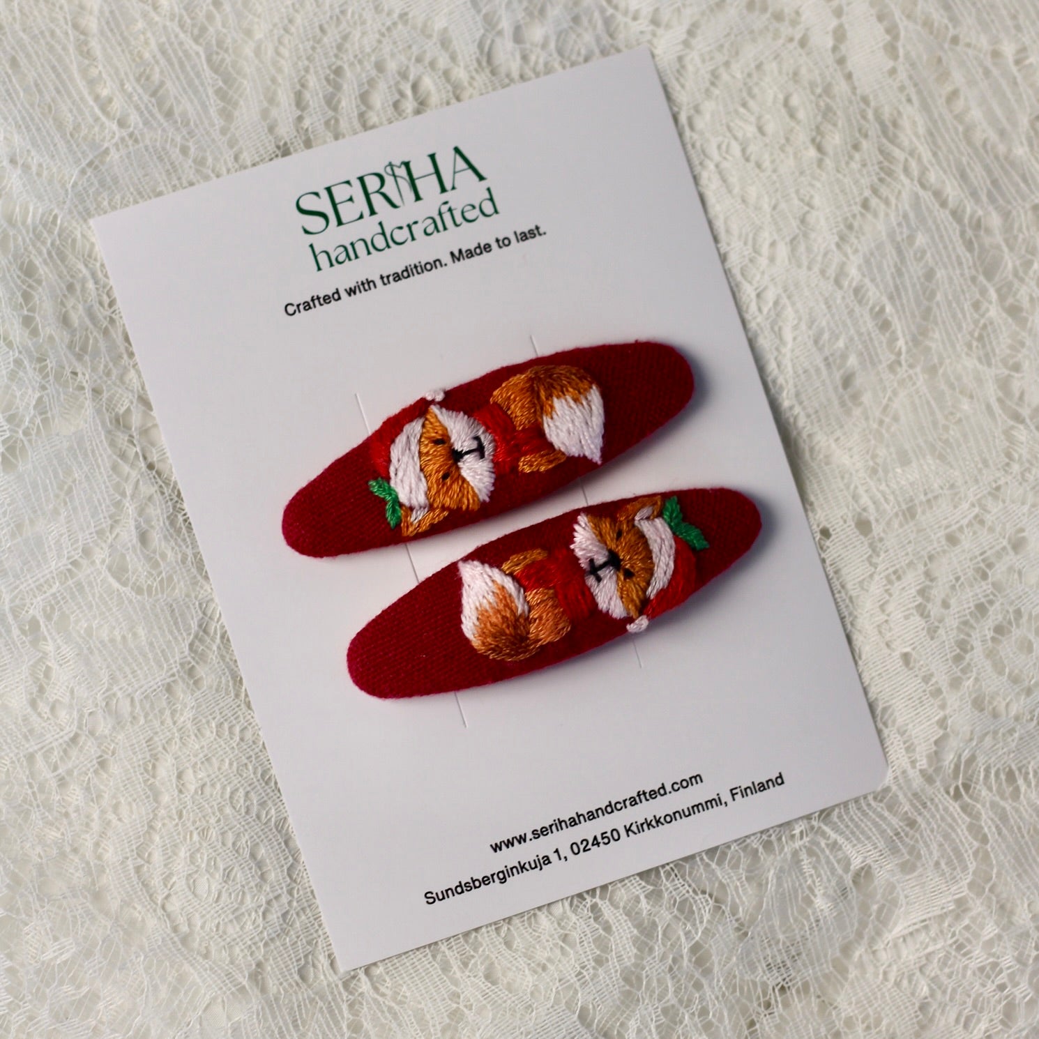 Let your little girl's personality shine through with this adorable, hand-embroidered fox hair clip. Made from soft and durable materials, this hair clip is the perfect addition to any style. Whether it's daycare, the playground or a Christmas party, this fun fox hairpin will bring a smile to your face. Each hair clip is unique and made with love, combining style and ecology.