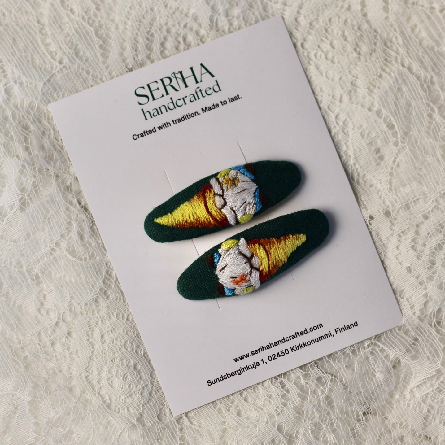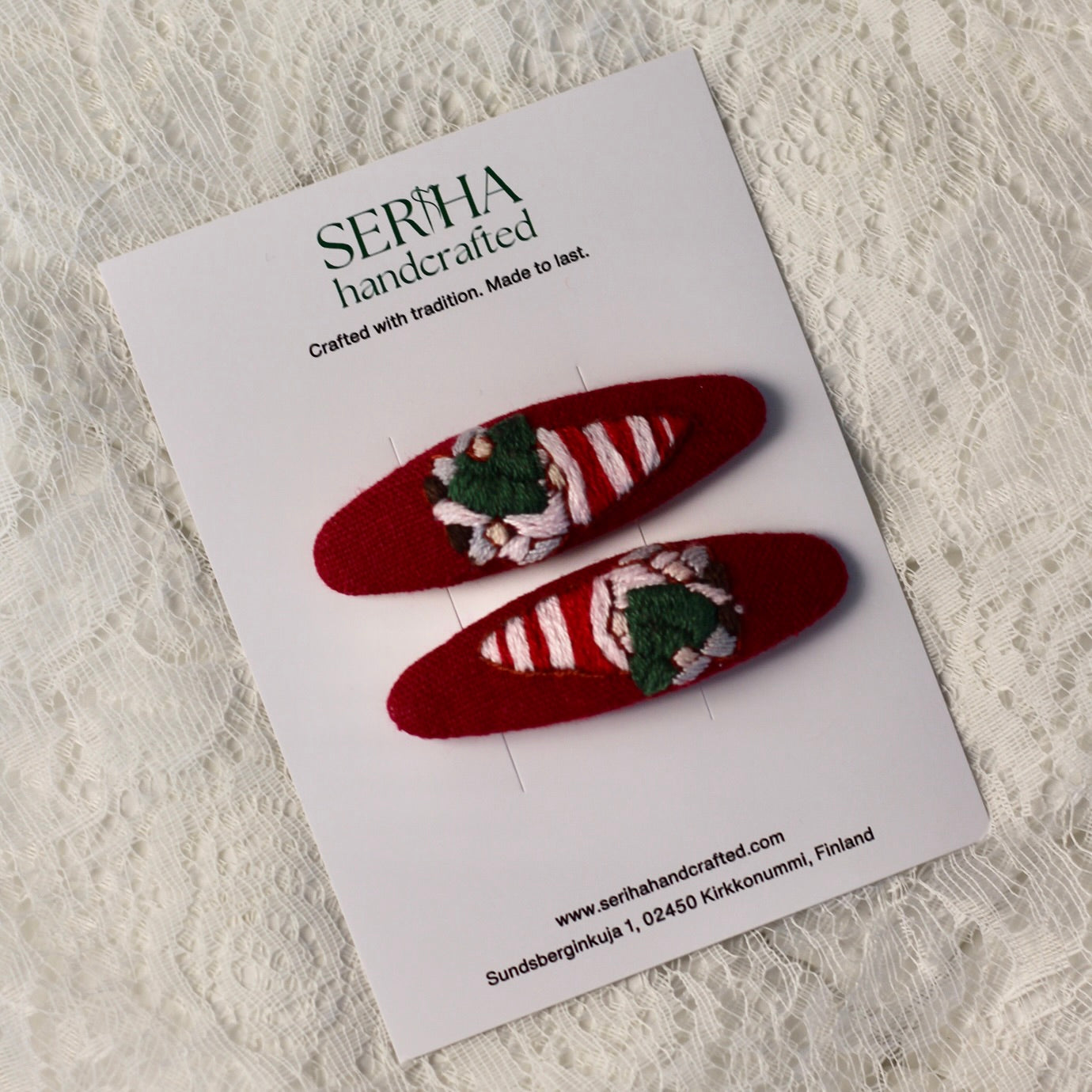 These hairpins, adorned with a delicate embroidered Christmas Elf pattern, is expertly handcrafted from recycled natural materials. Each piece is unique, showcasing the beauty of repurposed materials transformed into a stunning accessory. The intricate stitching and natural tones combine to create a durable and elegant piece. A perfect gift for those who appreciate both style and sustainability.