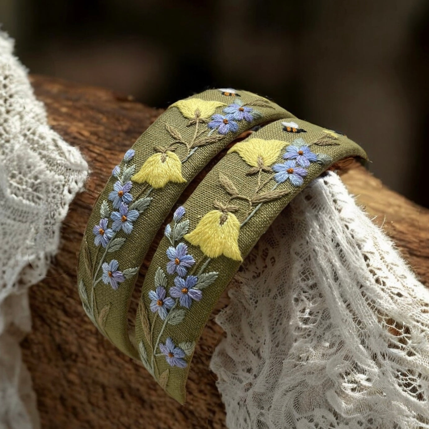 This headband, decorated with a delicate embroidered floral pattern, is expertly handcrafted from recycled natural materials. Each piece is unique, as the materials have been given a new life in this beautiful piece of jewelry. The sophisticated embroidery stitches and natural tones create a durable and elegant ensemble. The perfect gift for anyone who values both style and the environment.