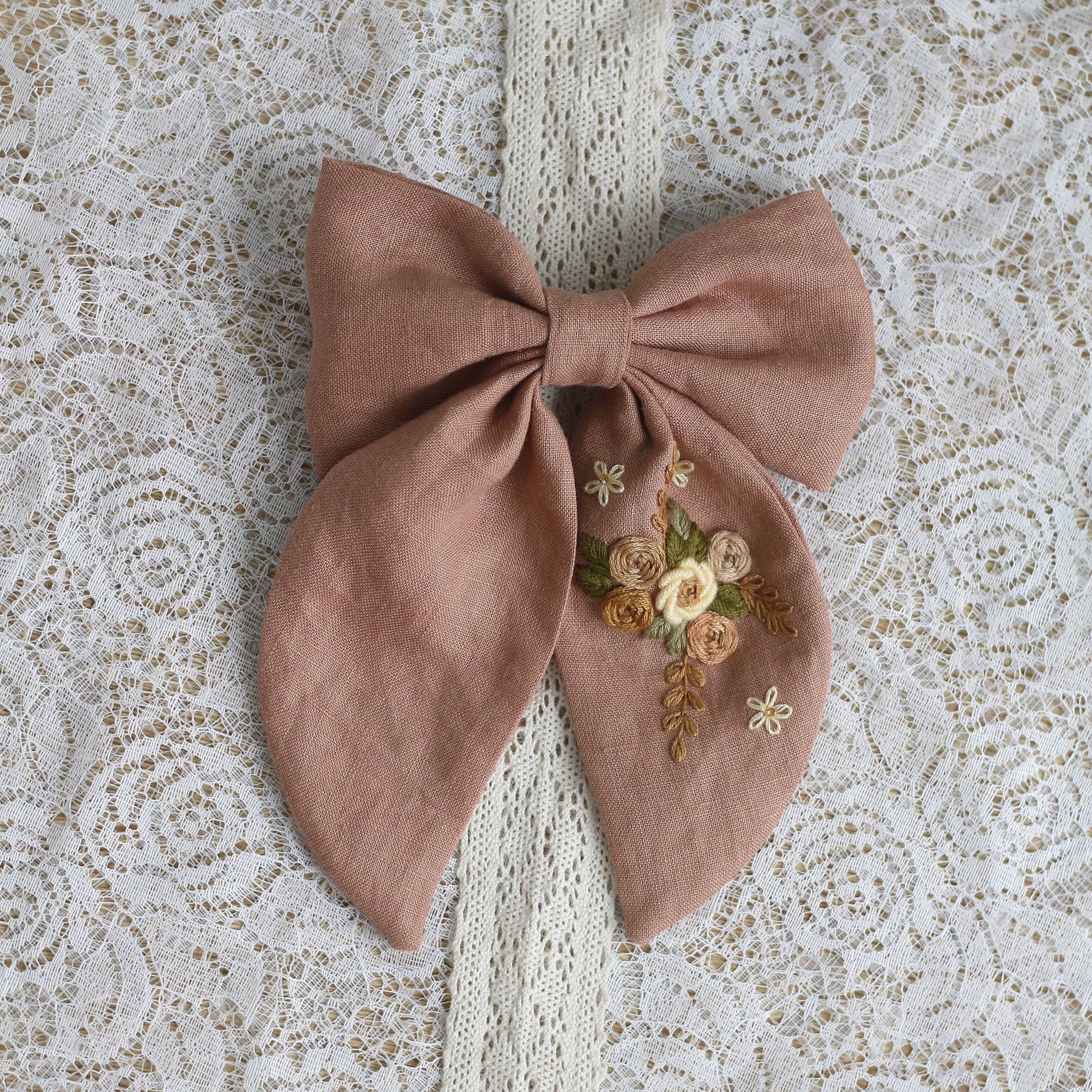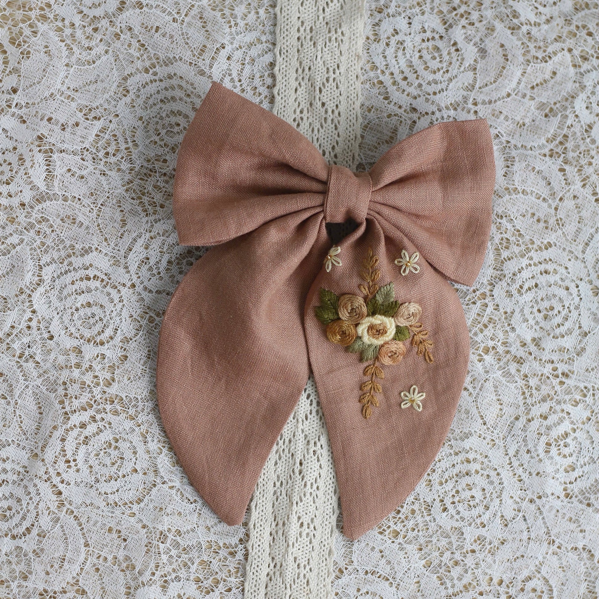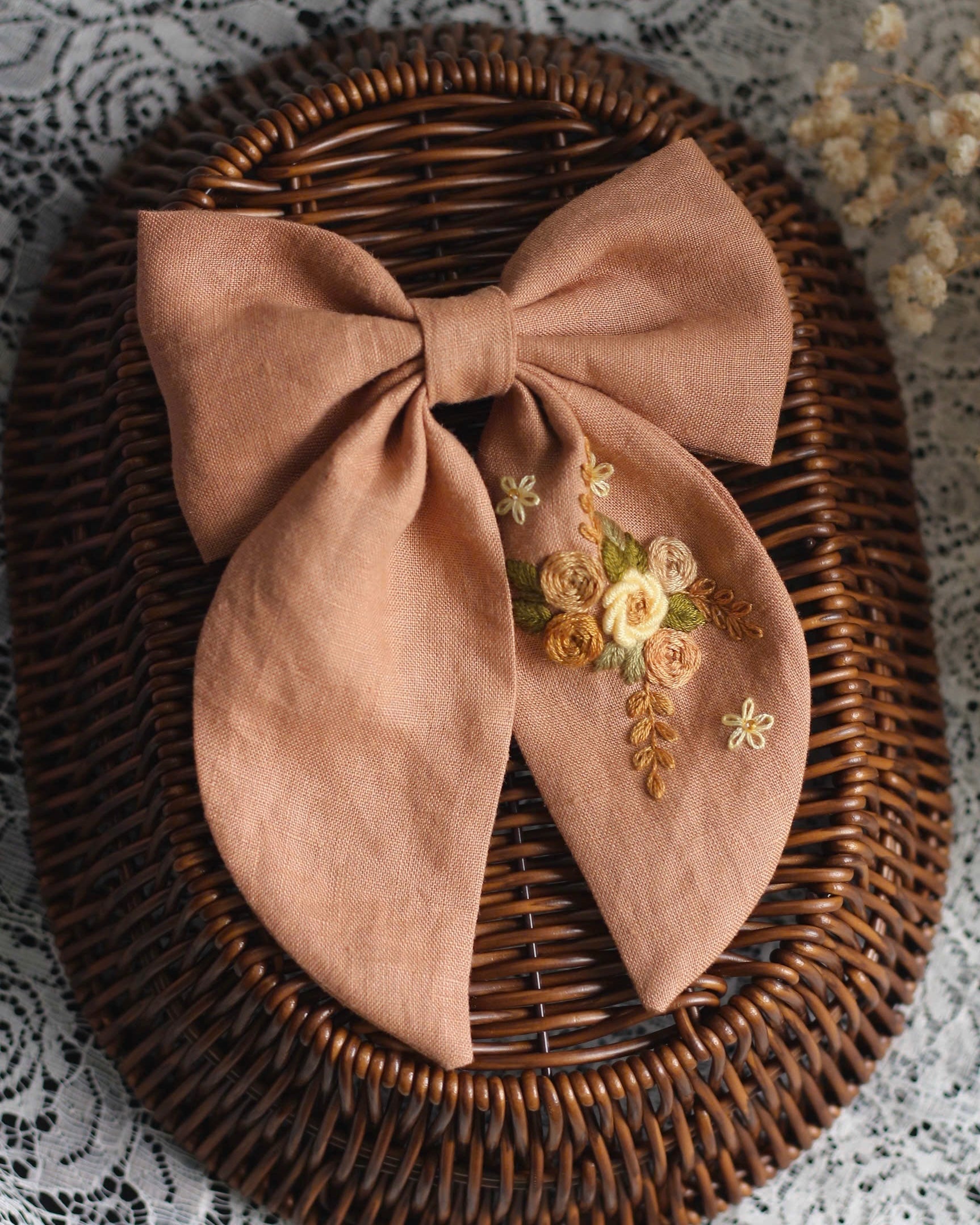 This delicately embroidered floral bow is expertly handcrafted from recycled natural materials. Each piece is unique as the materials have been given a new life in this beautiful piece of jewelry. The sophisticated embroidery stitches and natural tones create a durable and elegant ensemble. The perfect gift for anyone who values both style and the environment.