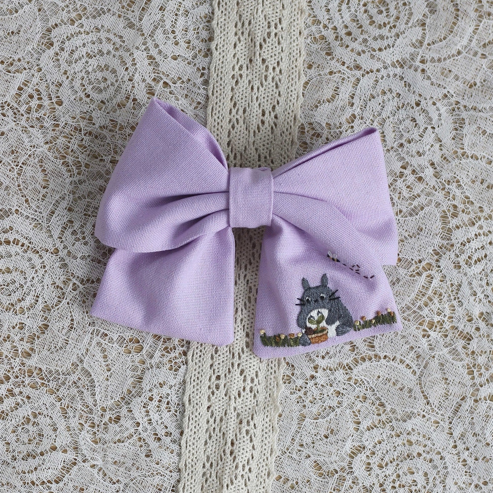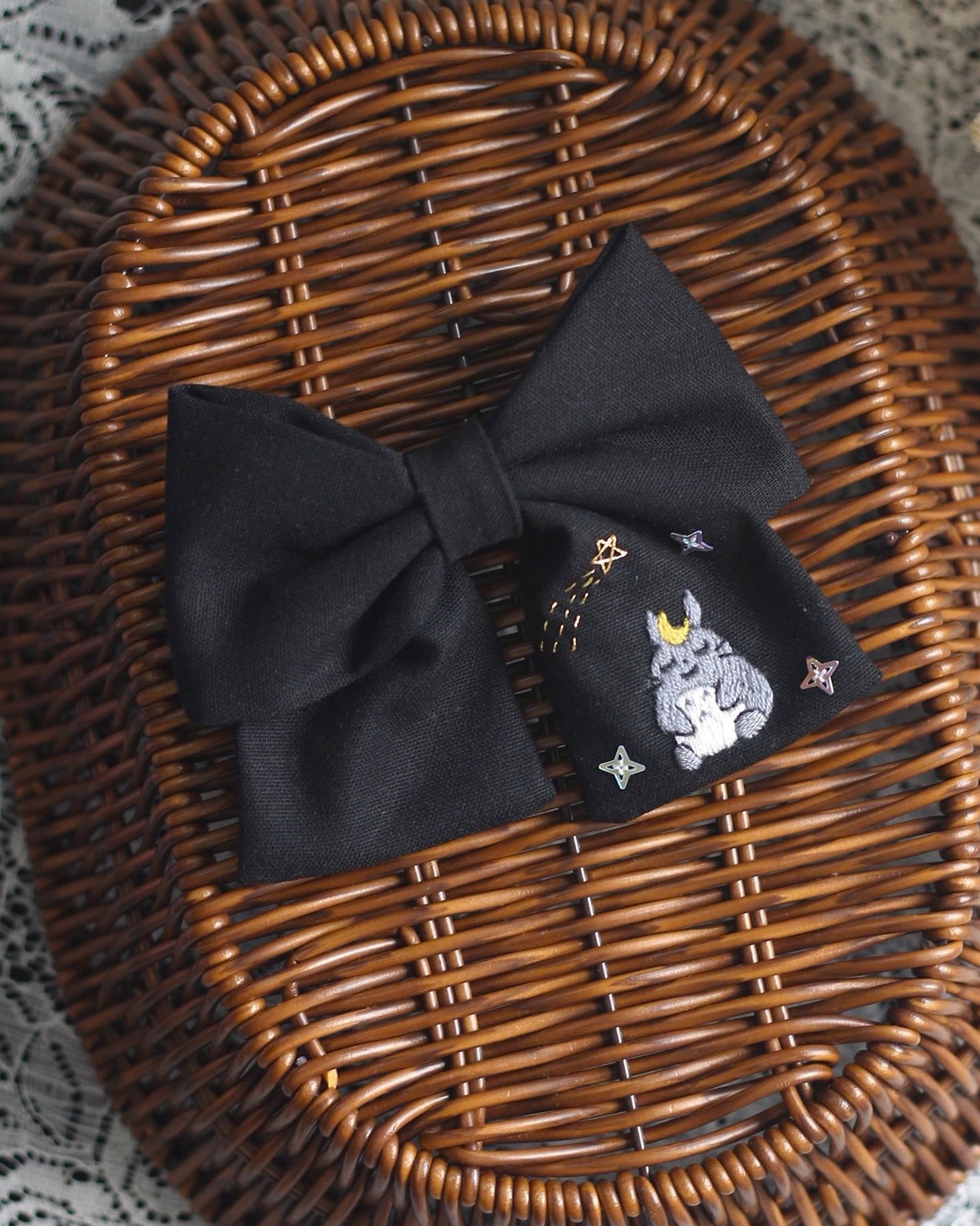 Our sweet embroidered design evokes the enchanting world of Ghibli and makes this hair bow a unique addition to your style. The bow is expertly handcrafted from recycled natural materials, and each piece is unique – the materials have been given a new lease of life in this charming accessory. The sophisticated embroidery stitches and natural tones create a durable and charming ensemble. The perfect gift for anyone who values both personal style and the environment.