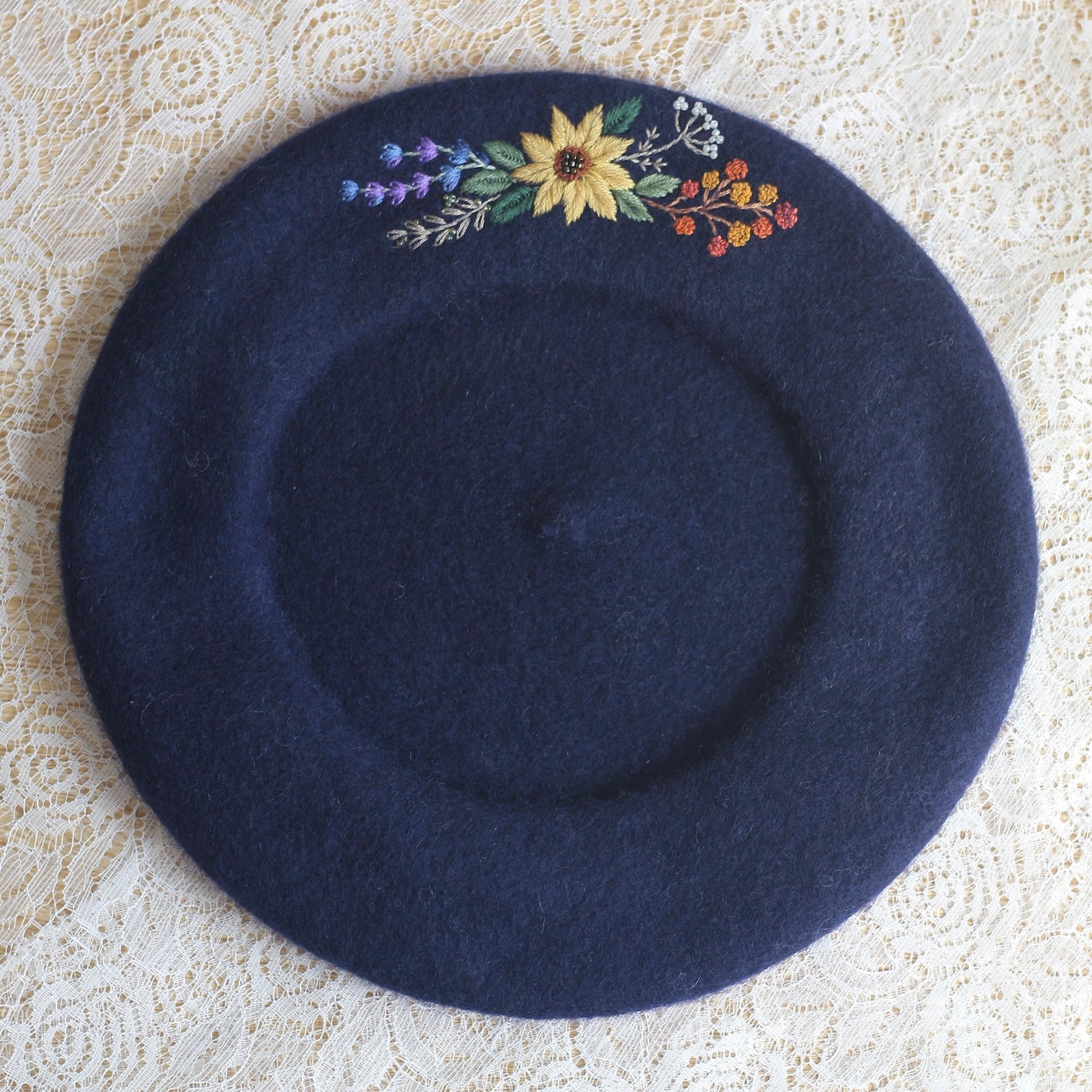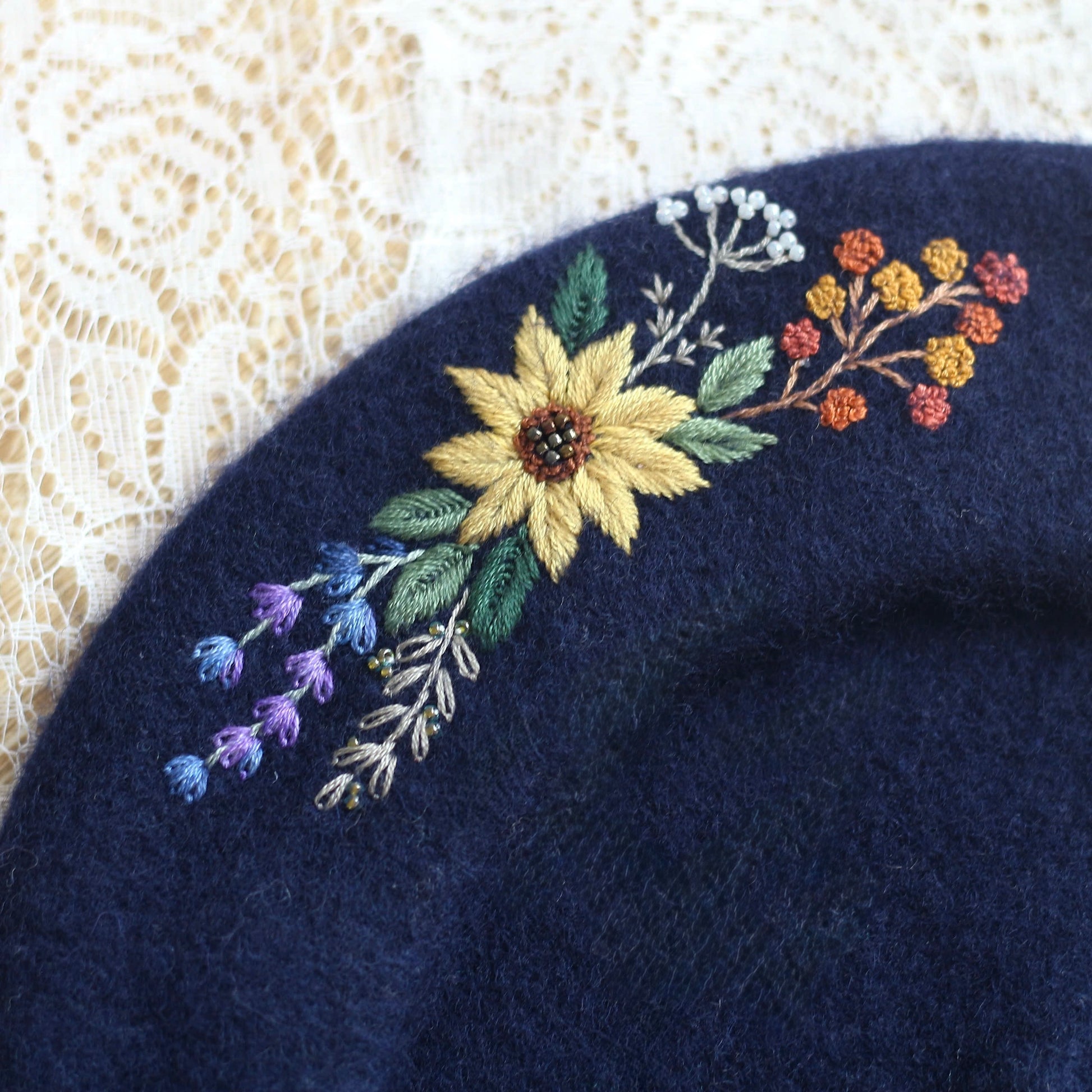 This hand-embroidered beret is more than an accessory, it's a little story made by hand. Made from 100% wool, the beret is patiently embroidered stitch by stitch, taking time, care and intention to shape every detail.