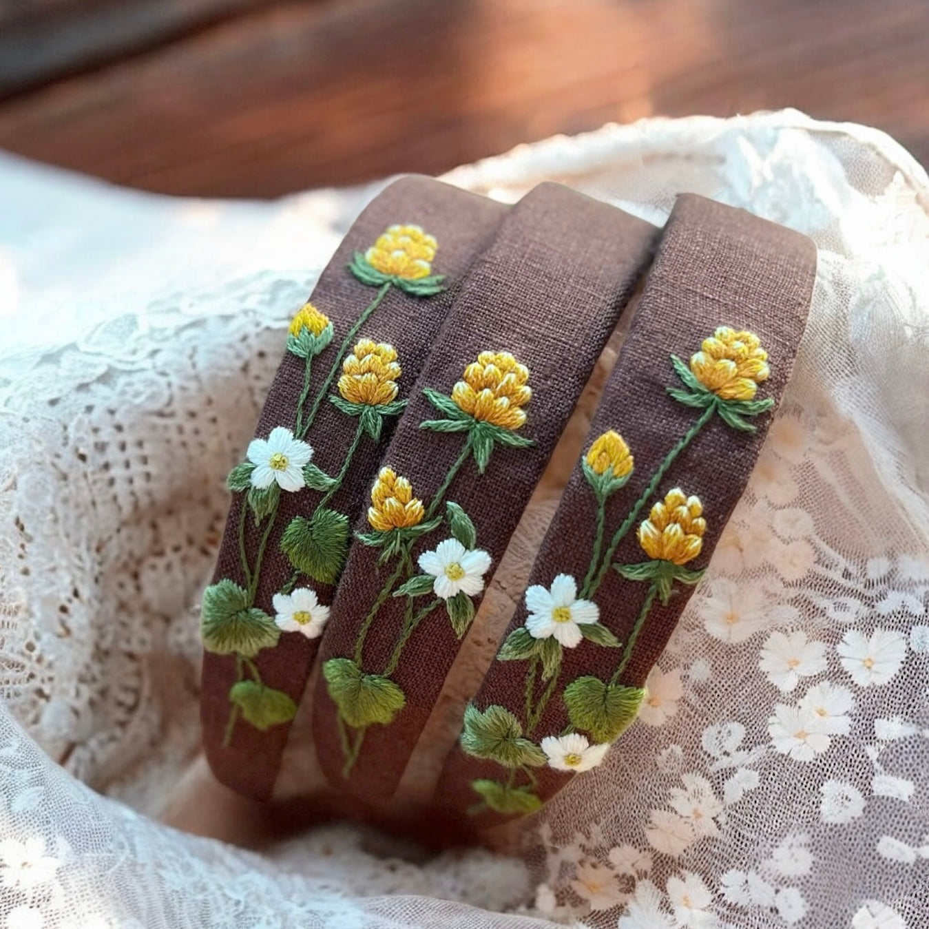 This headband, decorated with a delicate embroidered floral pattern, is expertly handcrafted from recycled natural materials. Each piece is unique, as the materials have been given a new life in this beautiful piece of jewelry. The sophisticated embroidery stitches and natural tones create a durable and elegant ensemble. The perfect gift for anyone who values both style and the environment.