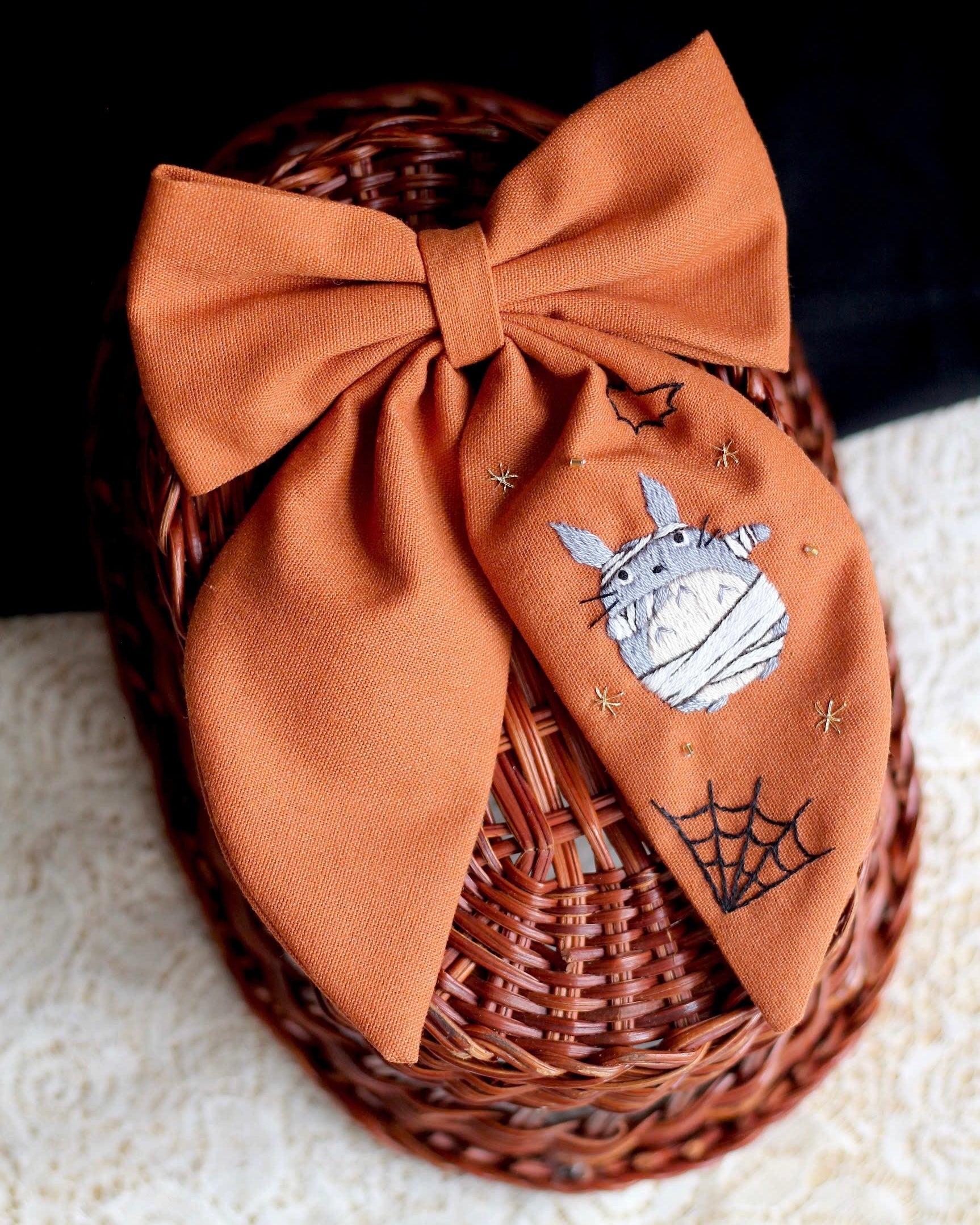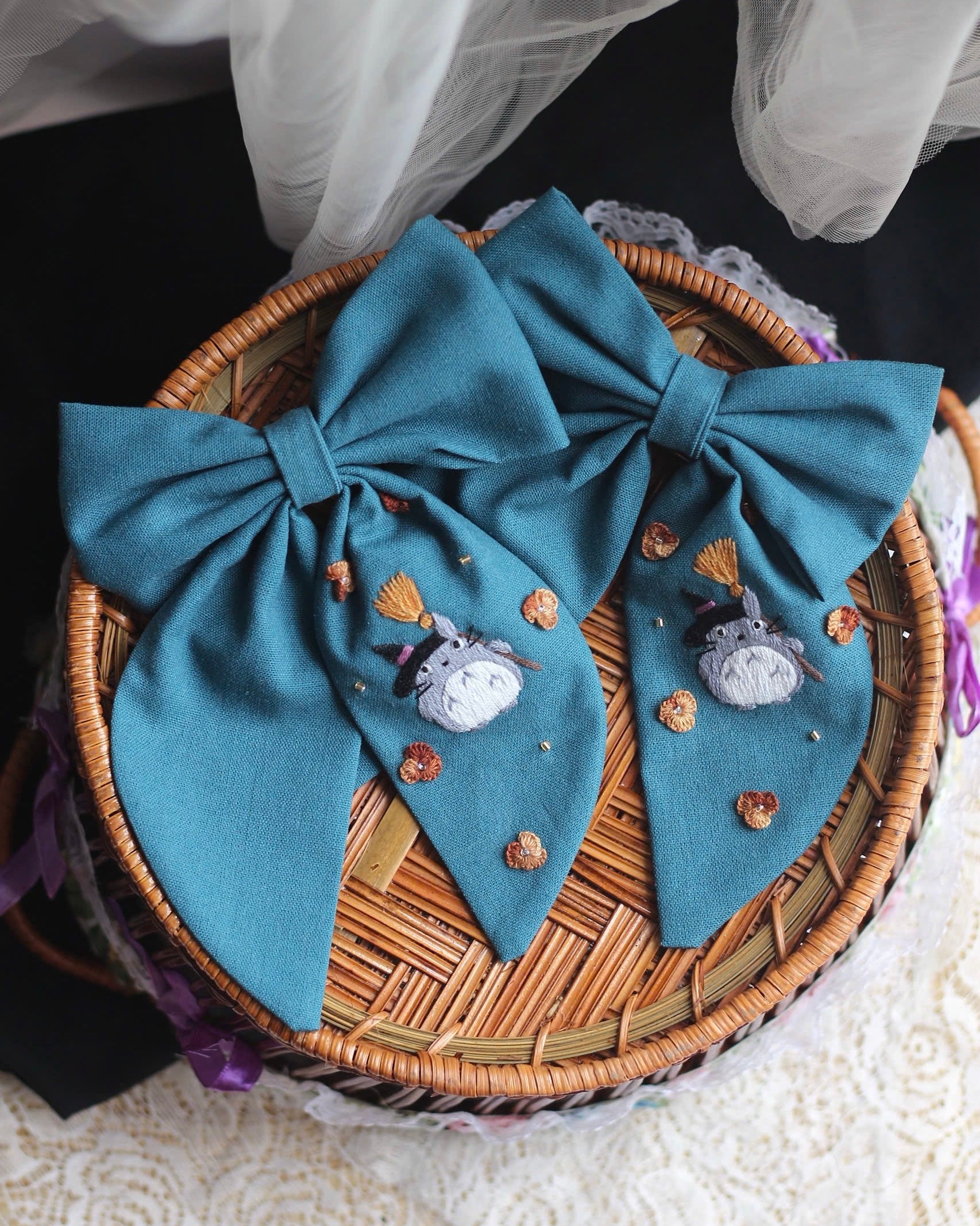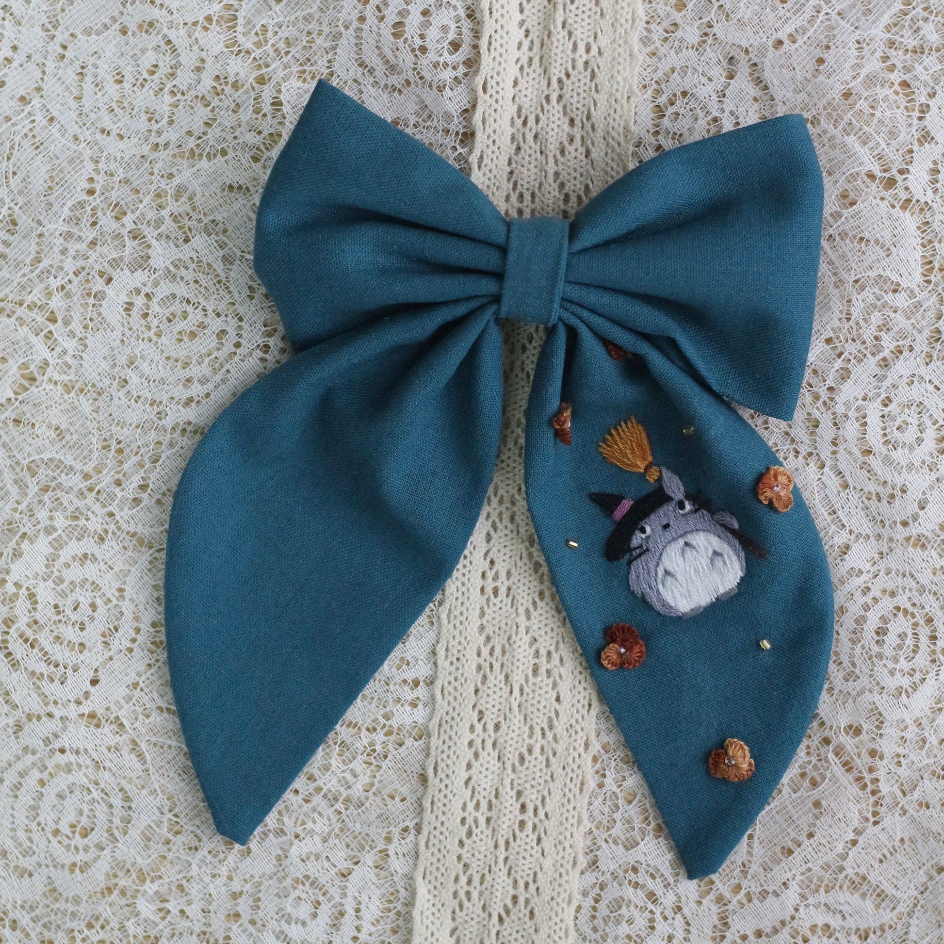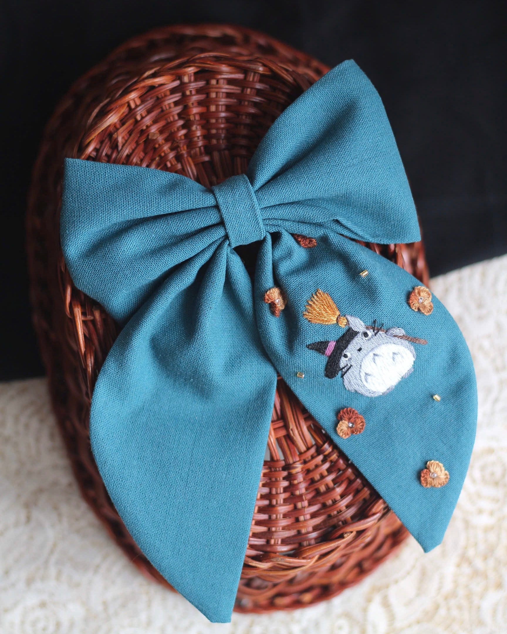 Our sweet embroidered pattern brings to mind Ghibli’s enchanting world and makes this hair bow a unique addition to your style. The bow is skillfully handmade from recycled natural materials, and each piece is one of a kind. The fabrics have been given a new life in this charming accessory. Refined embroidery stitches and natural tones create a durable and delightful whole. A perfect gift for anyone who values both personal style and the environment.