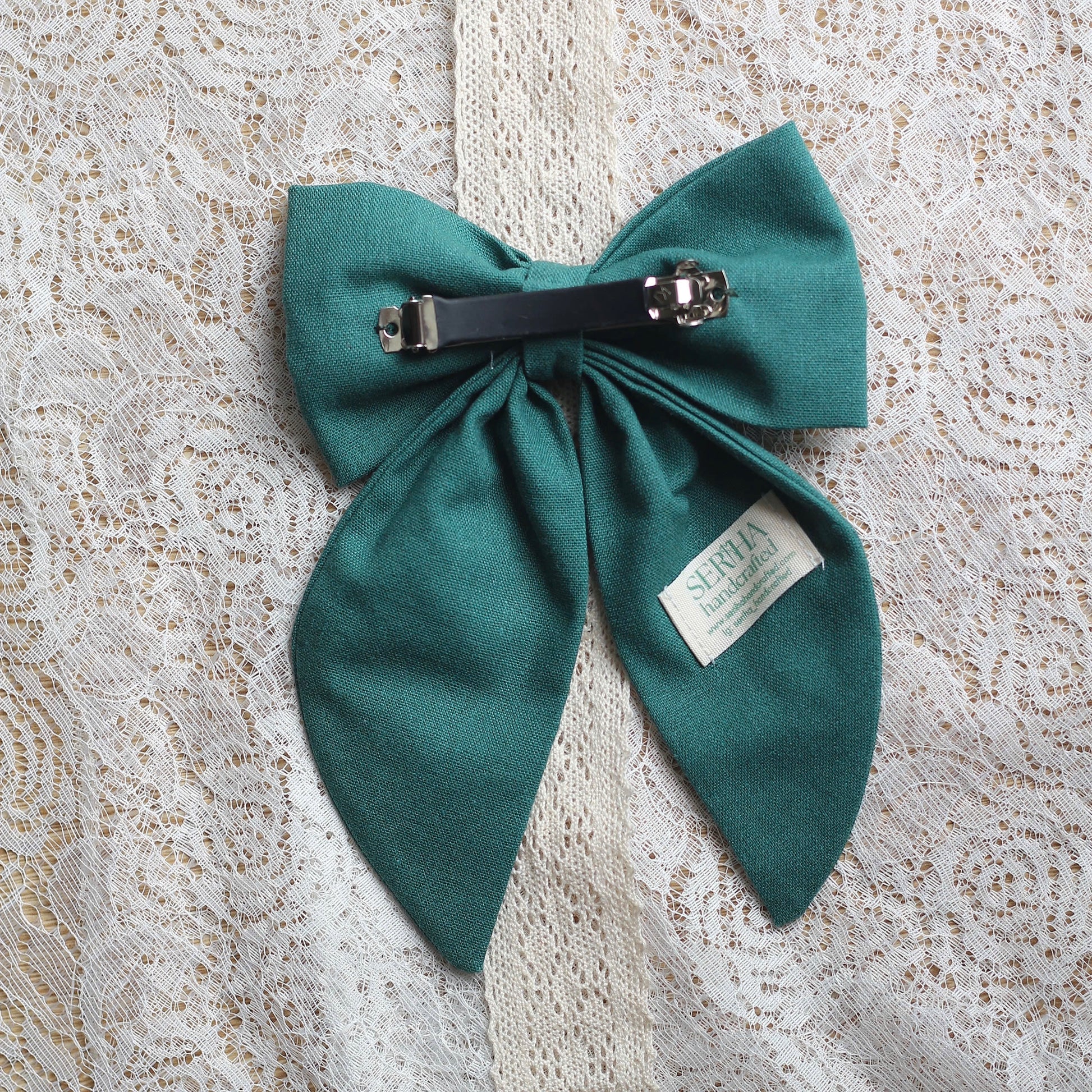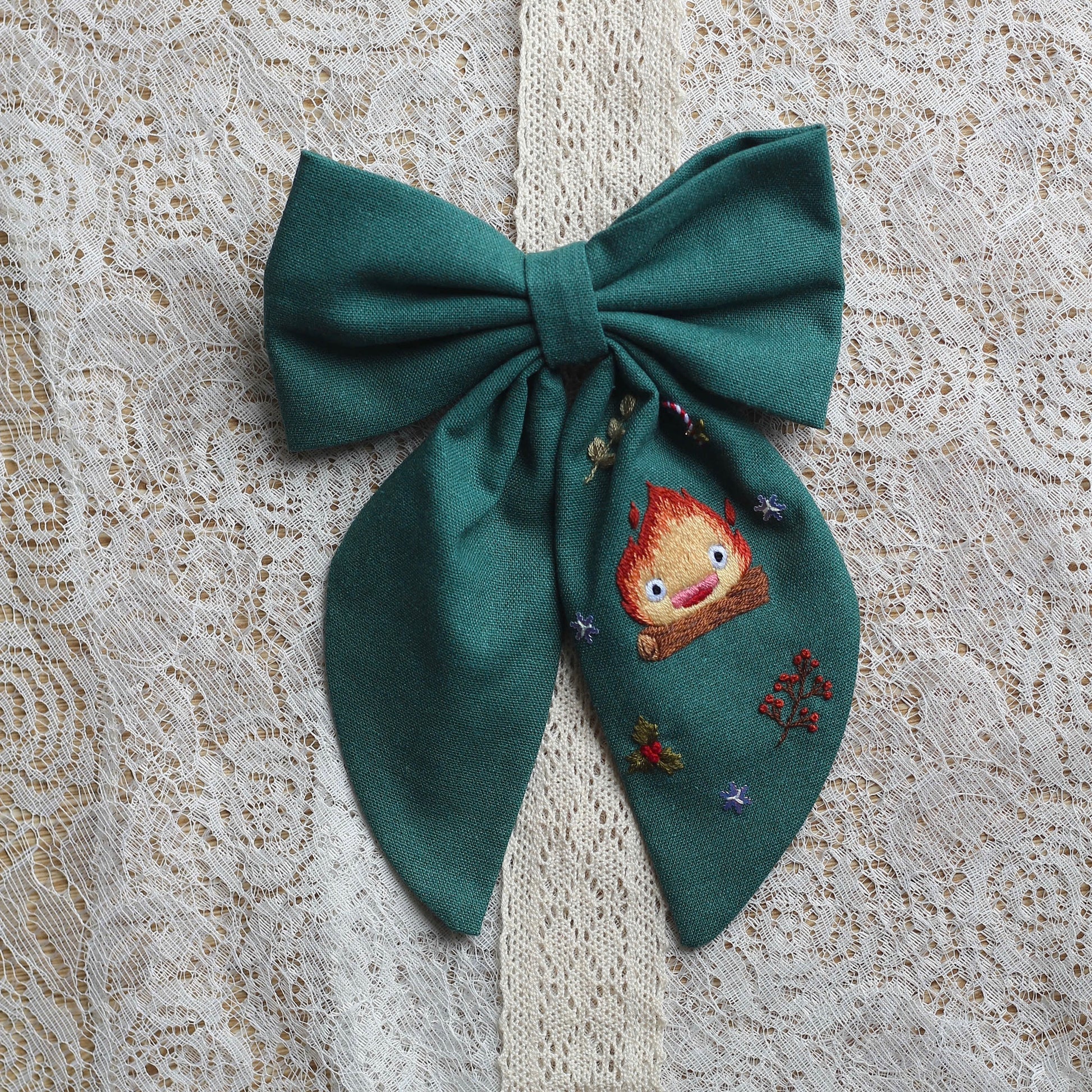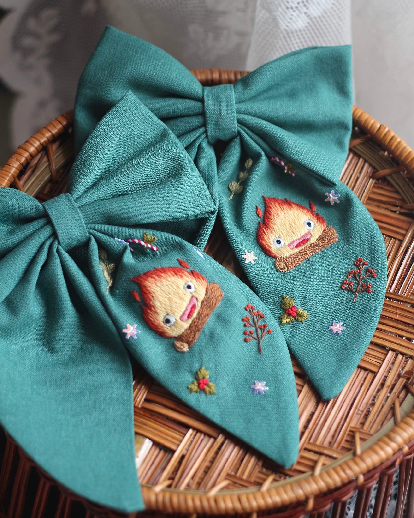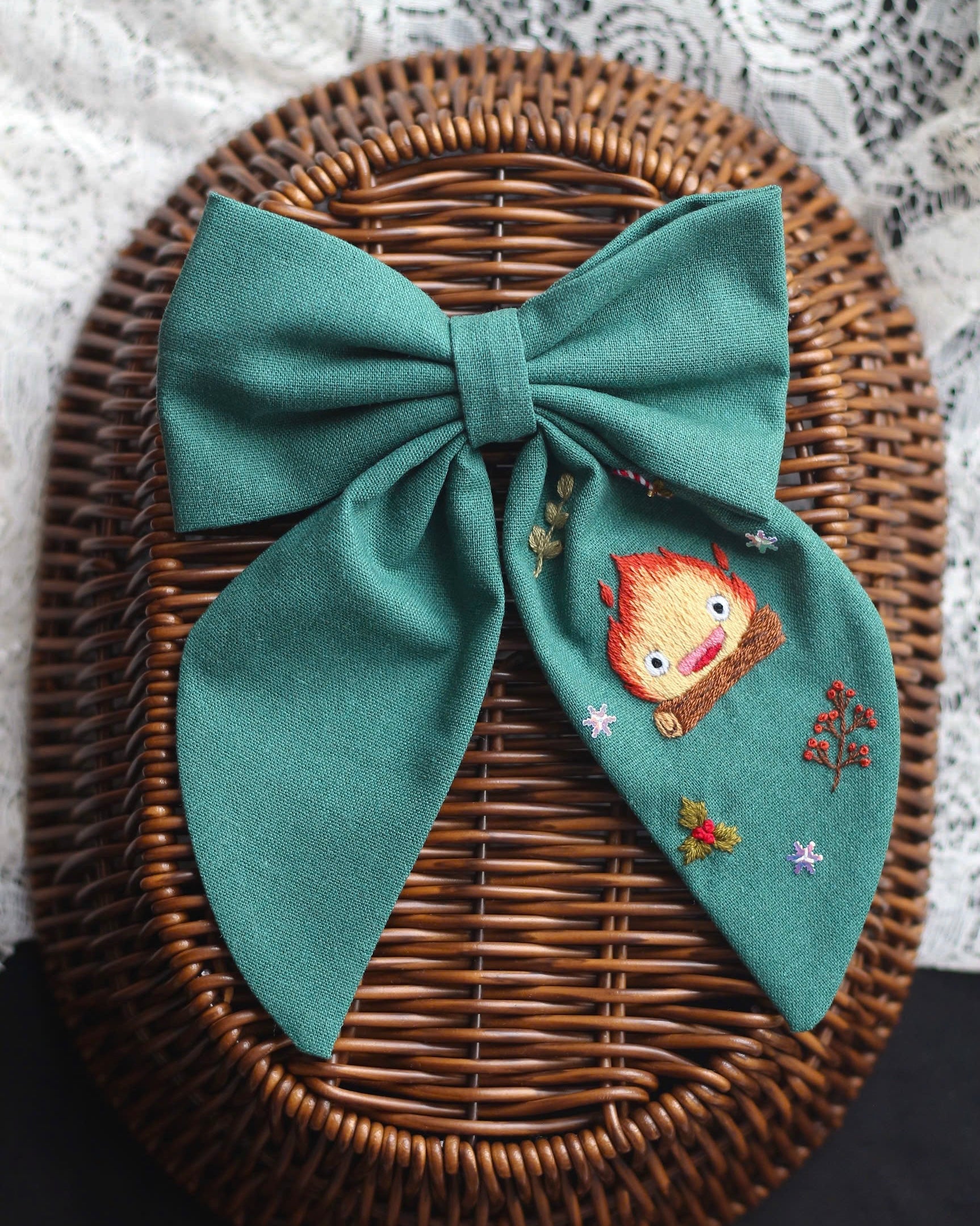 Our sweet embroidered pattern brings to mind Ghibli’s enchanting world and makes this hair bow a unique addition to your style. The bow is skillfully handmade from recycled natural materials, and each piece is one of a kind. The fabrics have been given a new life in this charming accessory. Refined embroidery stitches and natural tones create a durable and delightful whole. A perfect gift for anyone who values both personal style and the environment.