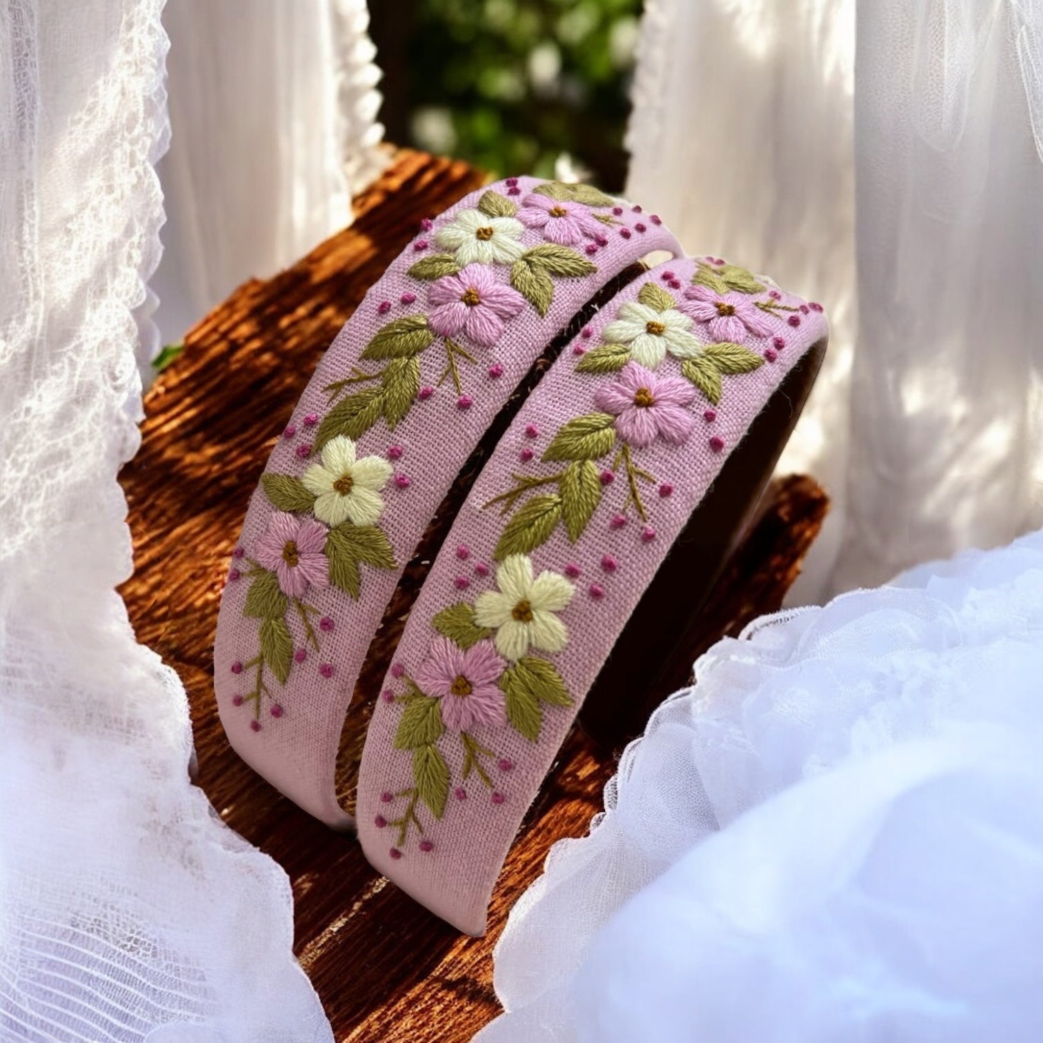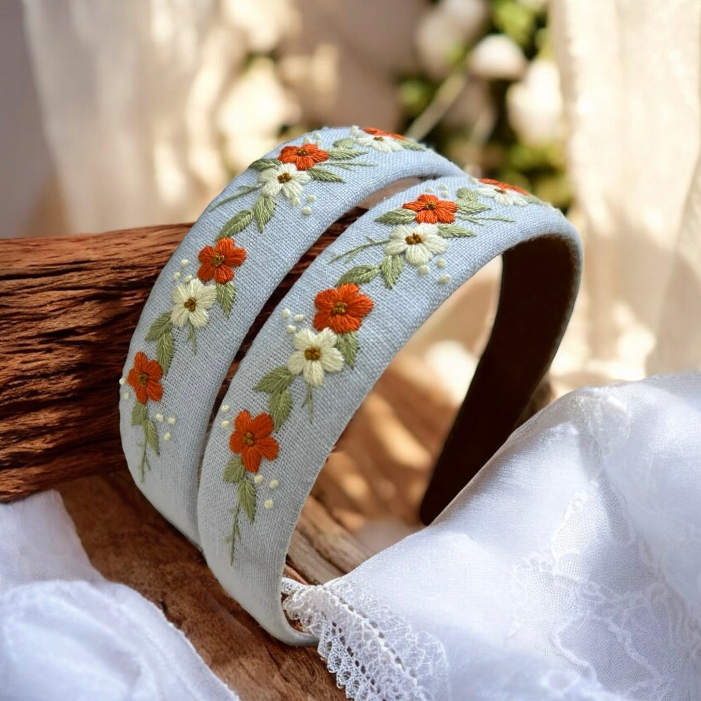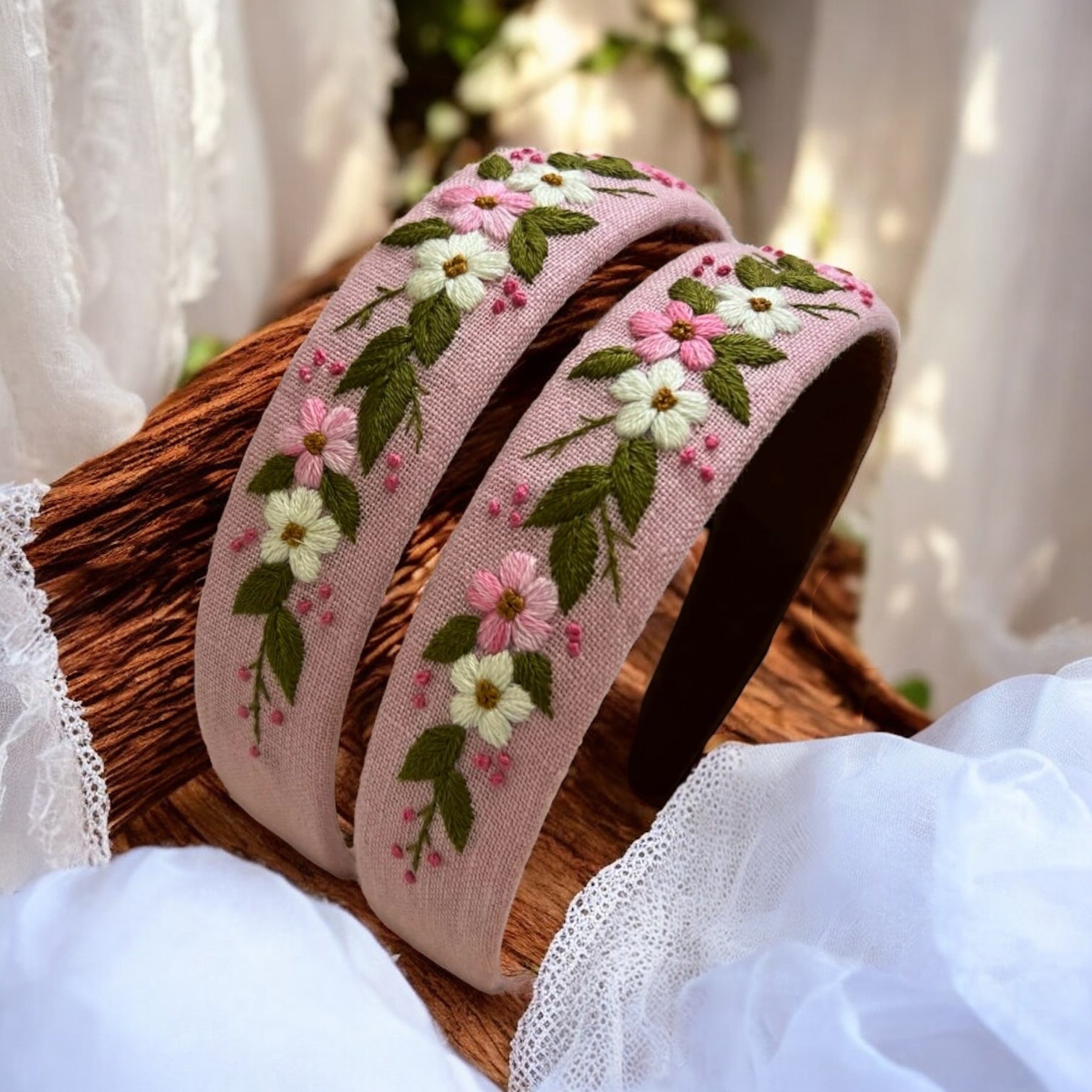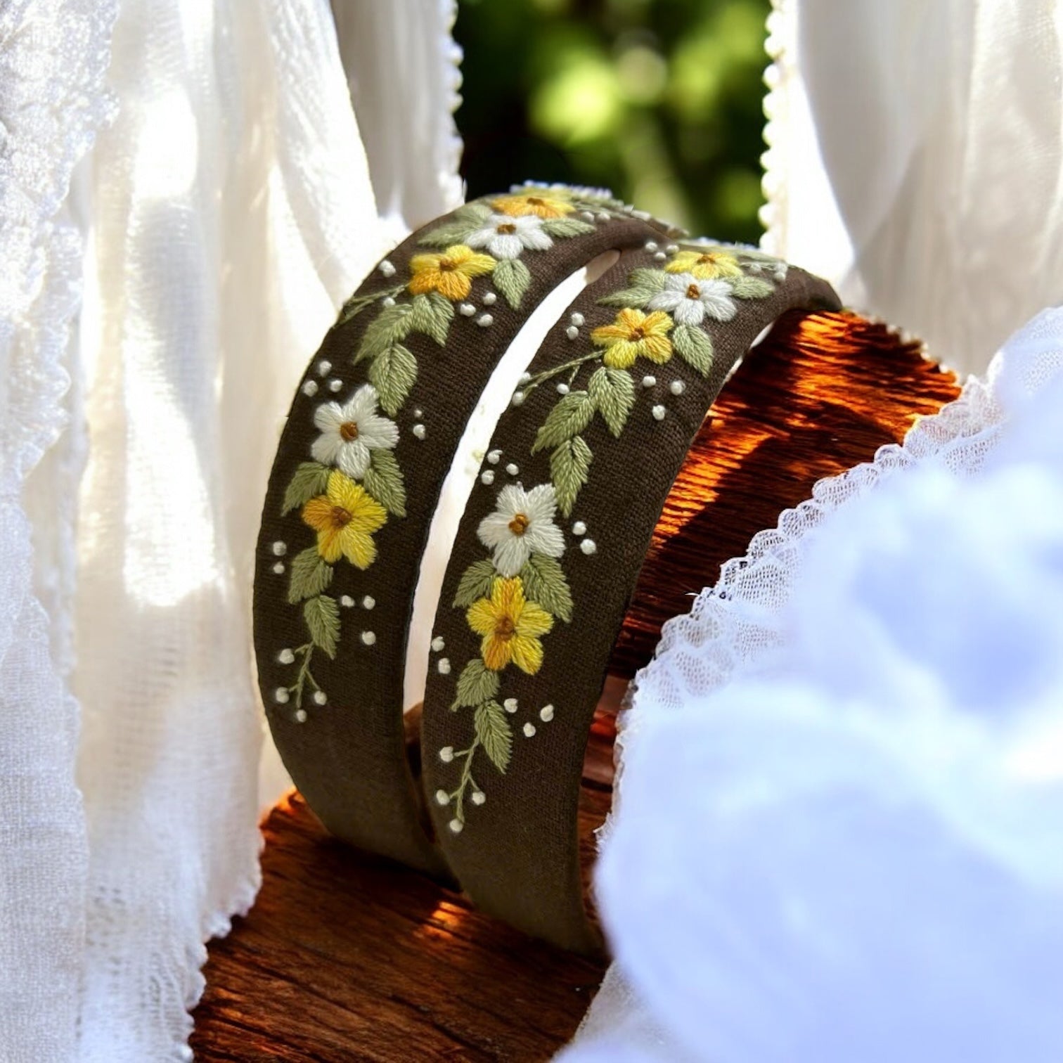 This headband, decorated with a delicate embroidered floral pattern, is expertly handcrafted from recycled natural materials. Each piece is unique, as the materials have been given a new life in this beautiful piece of jewelry. The sophisticated embroidery stitches and natural tones create a durable and elegant ensemble. The perfect gift for anyone who values both style and the environment.