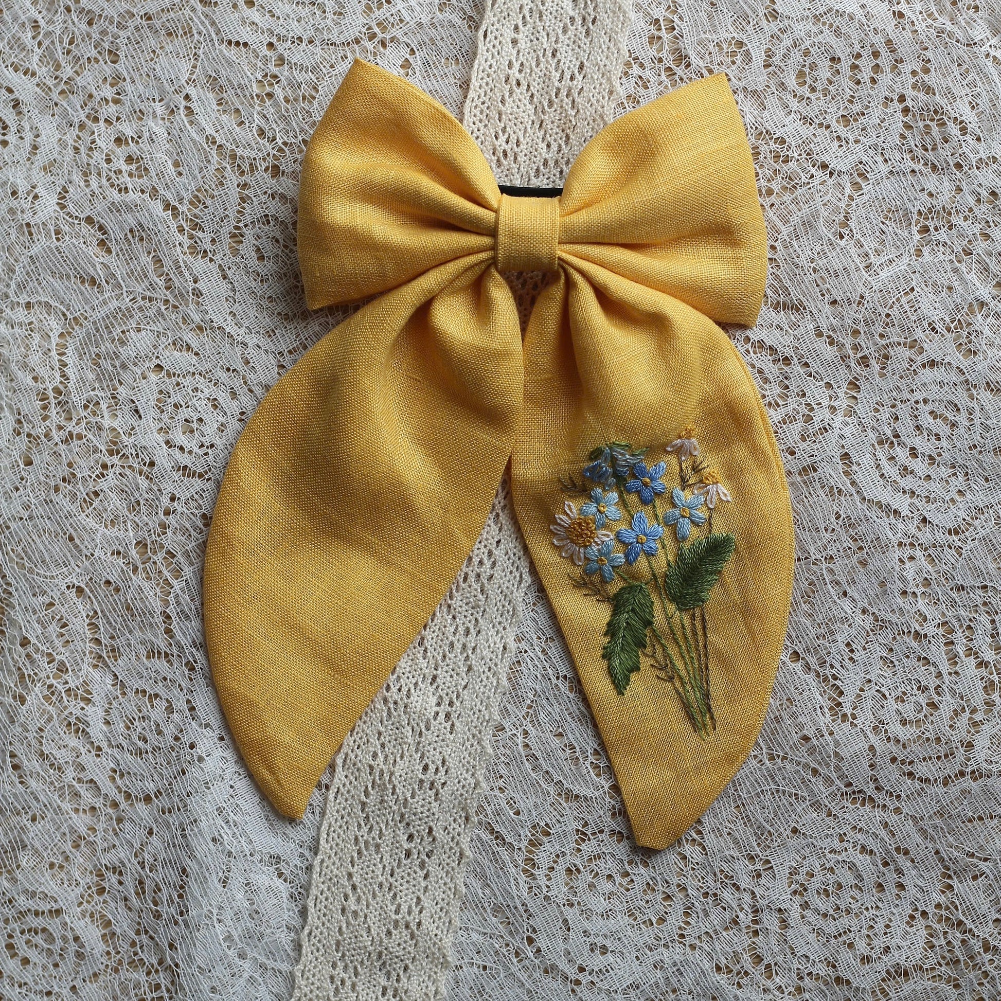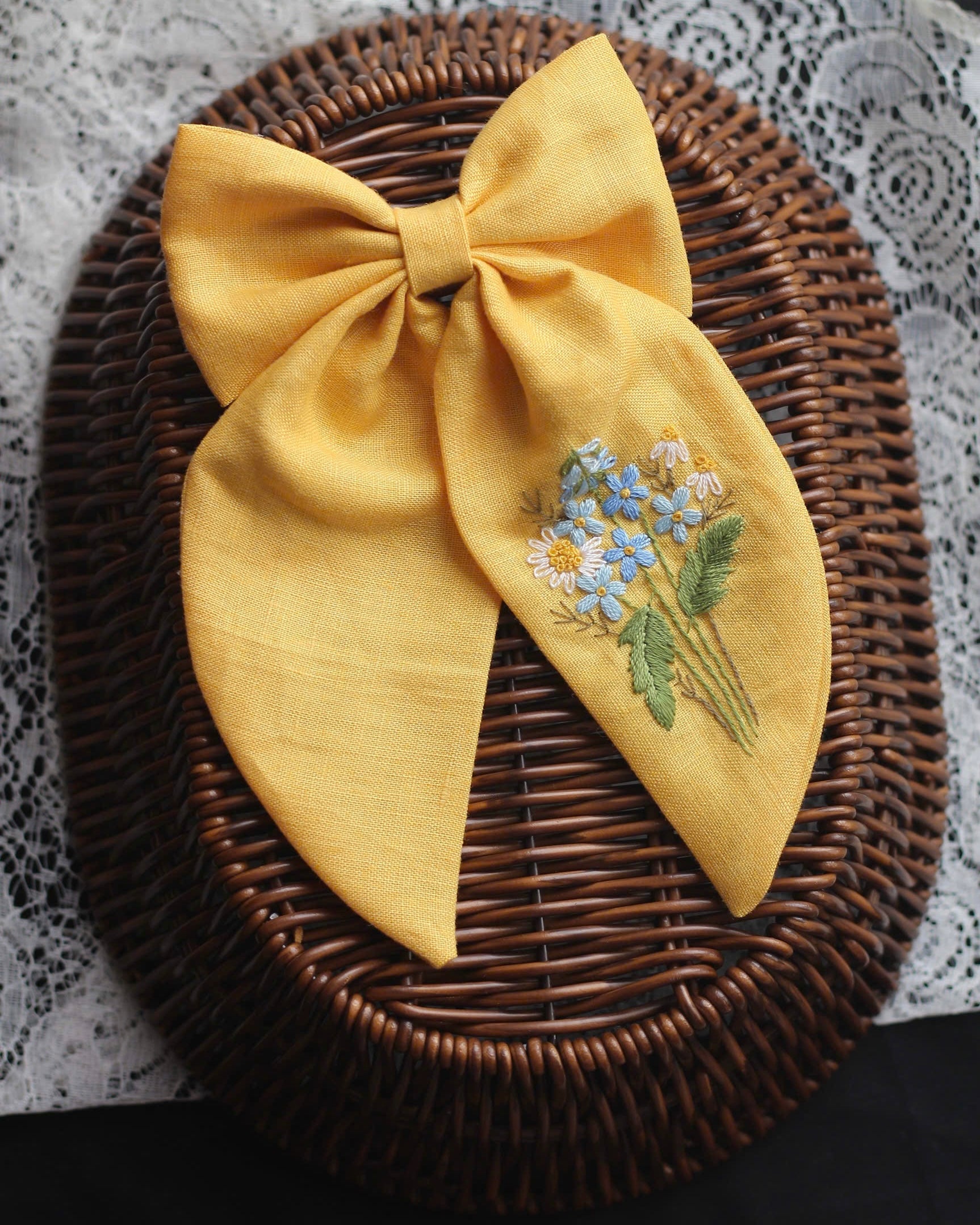 This delicately embroidered floral bow is expertly handcrafted from recycled natural materials. Each piece is unique as the materials have been given a new life in this beautiful piece of jewelry. The sophisticated embroidery stitches and natural tones create a durable and elegant ensemble. The perfect gift for anyone who values both style and the environment.
