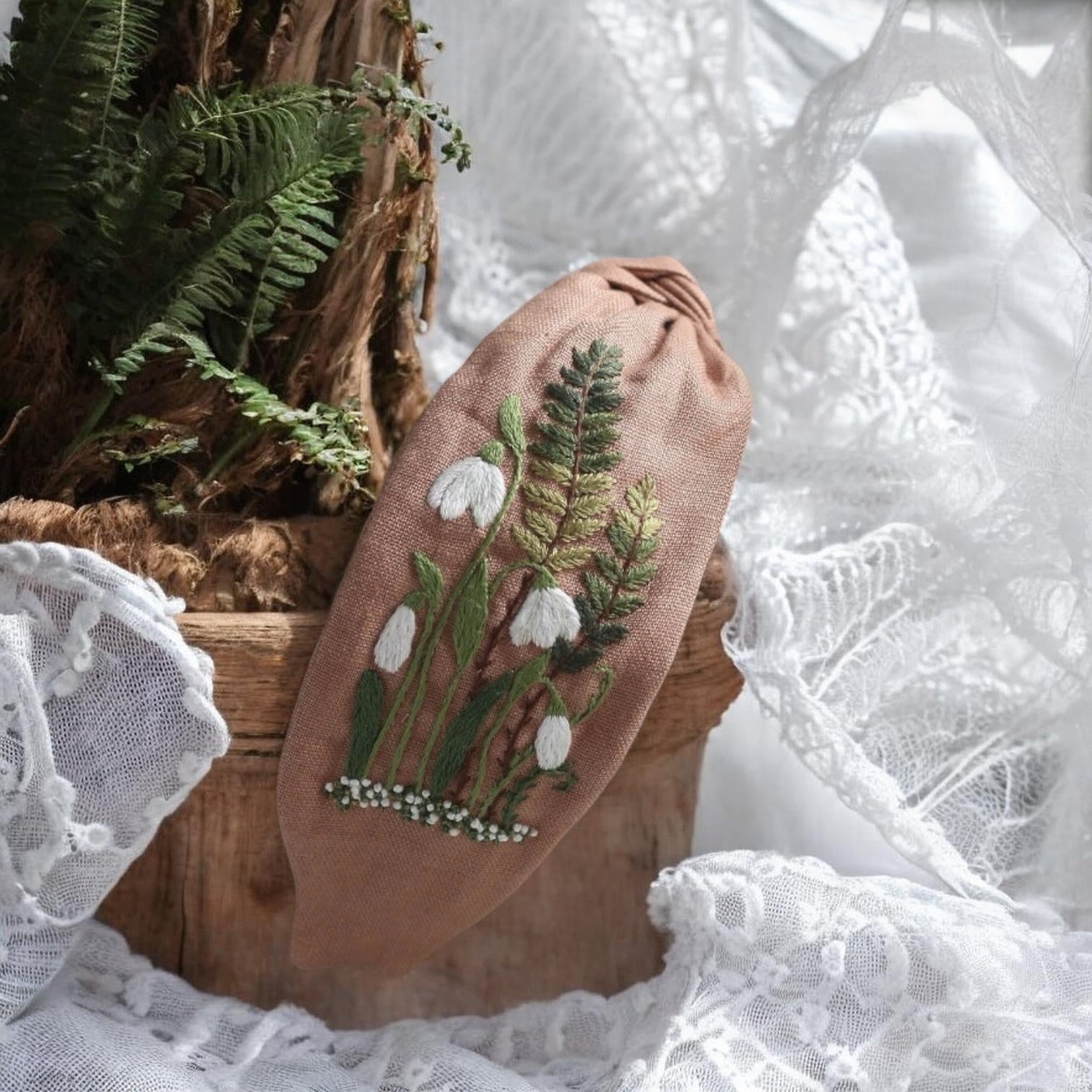 This headband is decorated with a delicate embroidered floral pattern and is expertly handcrafted from recycled natural materials. Each piece is unique, as the materials have been given a new life in this beautiful piece of jewelry. The sophisticated embroidery stitches and natural tones create a durable and elegant ensemble. The perfect gift for anyone who appreciates both style and the environment.