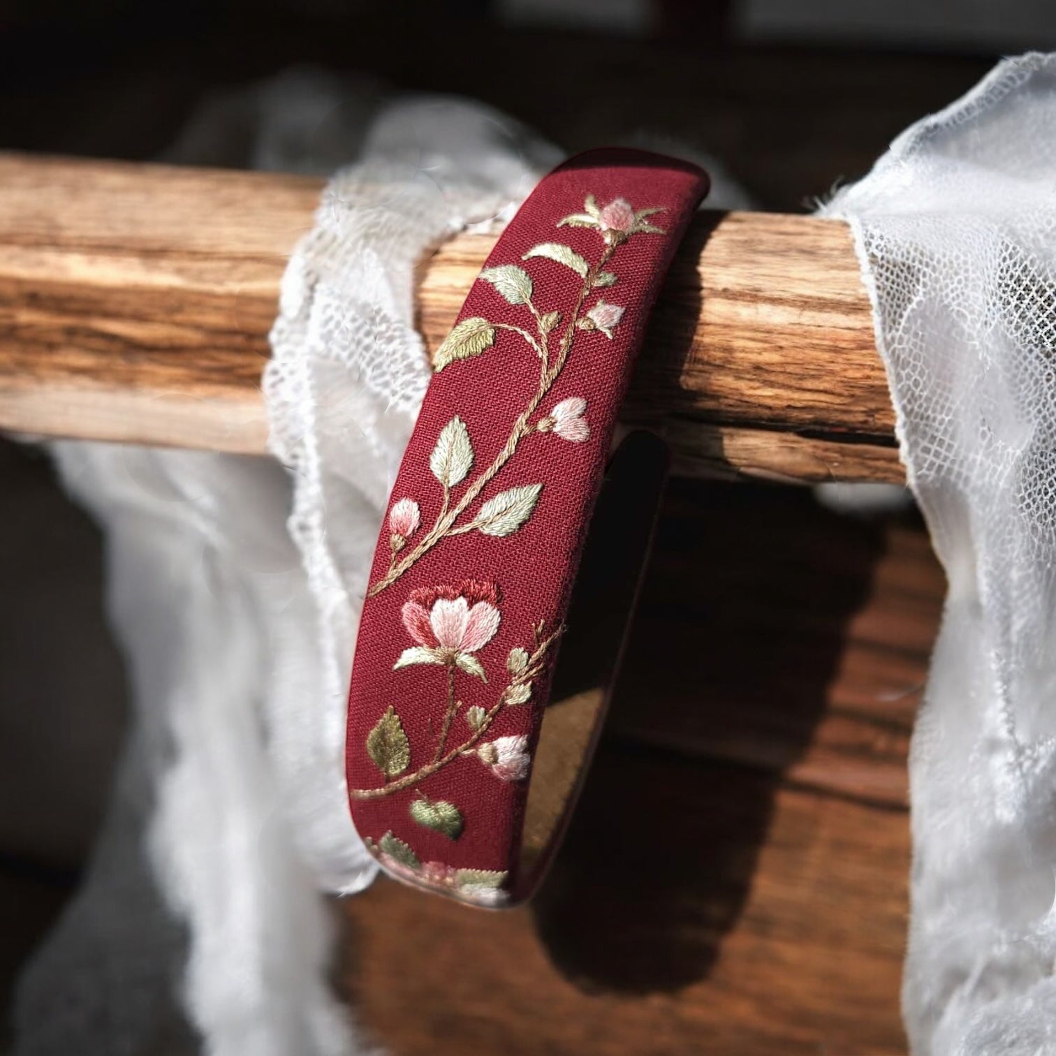 This headband, decorated with a delicate embroidered floral pattern, is expertly handcrafted from recycled natural materials. Each piece is unique, as the materials have been given a new life in this beautiful piece of jewelry. The sophisticated embroidery stitches and natural tones create a durable and elegant ensemble. The perfect gift for anyone who values both style and the environment.