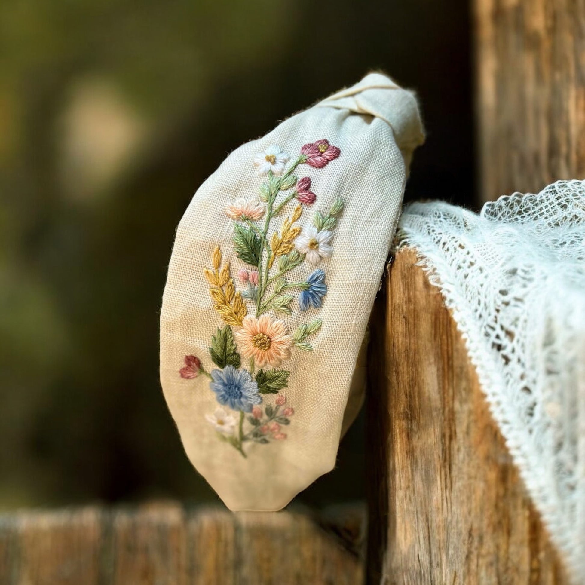 This hairband is decorated with a delicate embroidered floral pattern and is expertly handcrafted from recycled natural materials. Each piece is unique, as the materials have been given a new life in this beautiful piece of jewelry. The sophisticated embroidery stitches and natural tones create a durable and elegant ensemble. The perfect gift for anyone who appreciates both style and the environment.