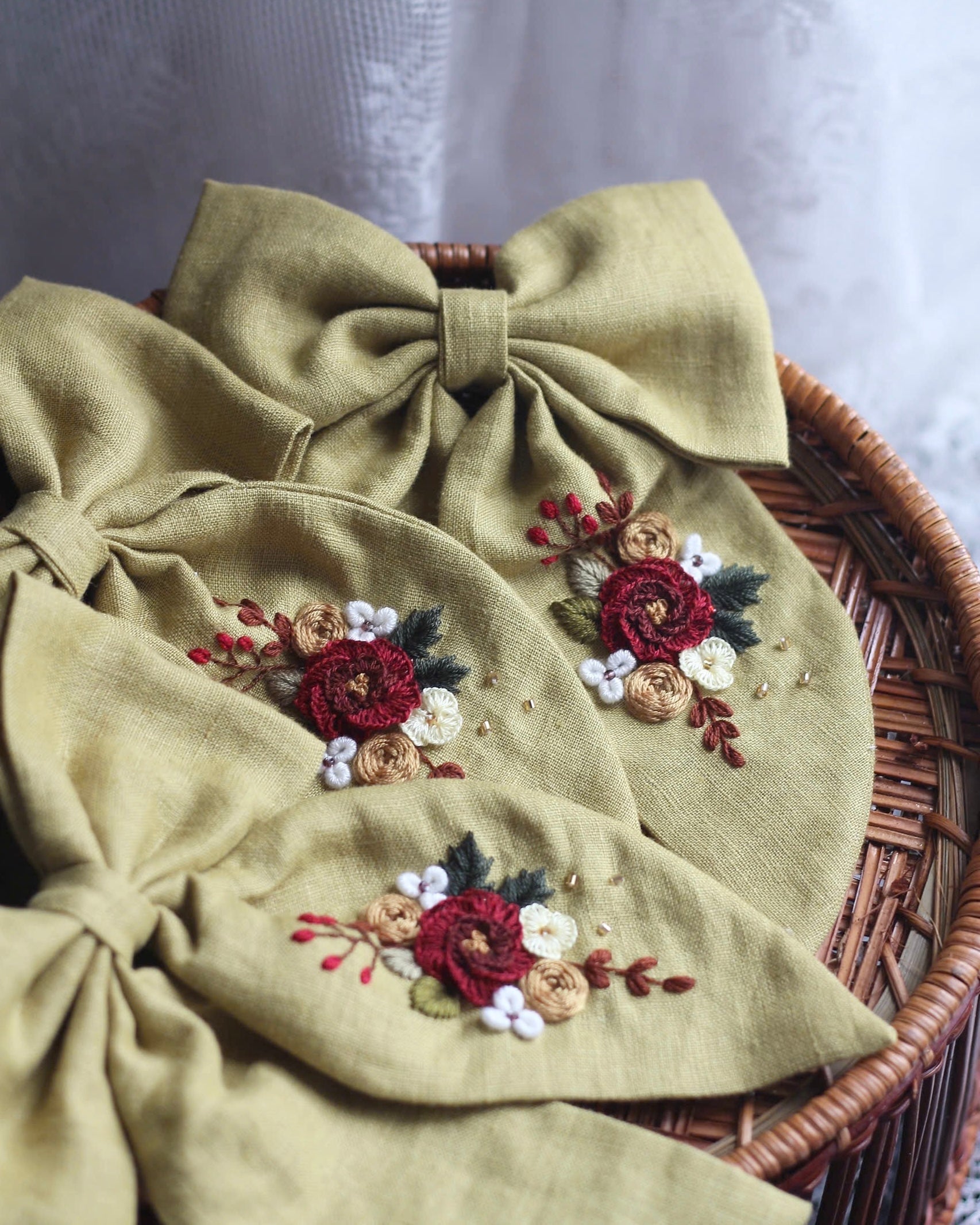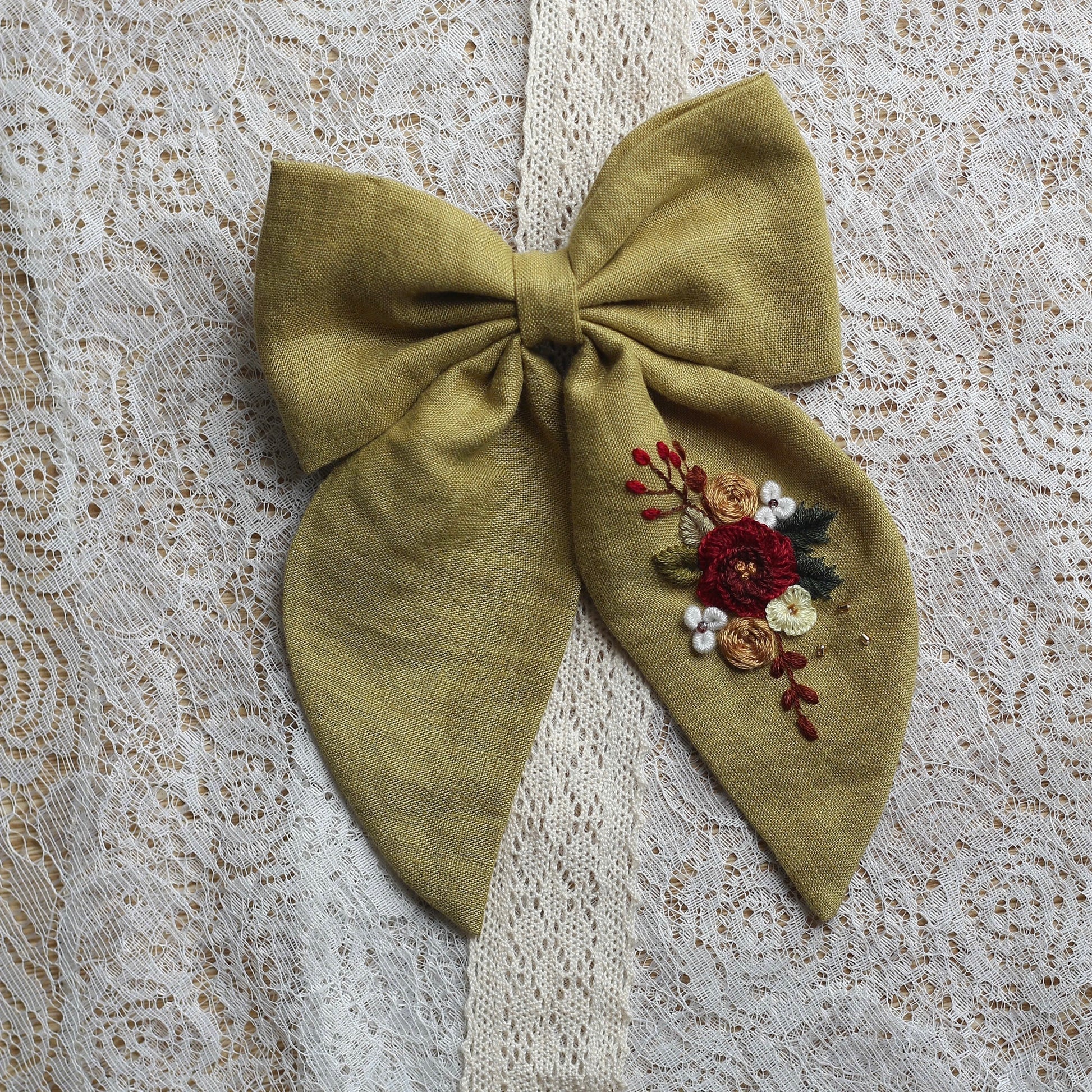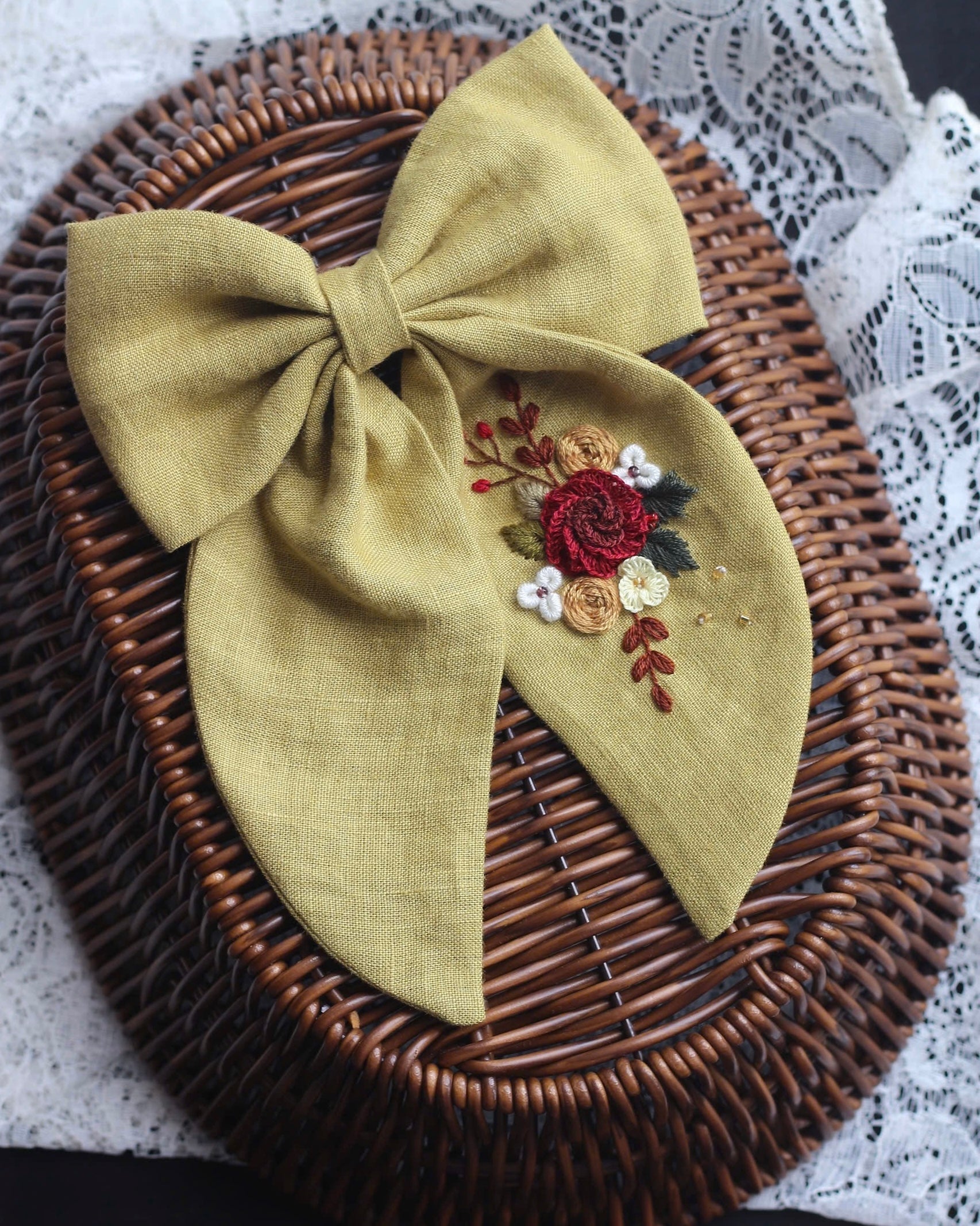This delicately embroidered floral bow is expertly handcrafted from recycled natural materials. Each piece is unique as the materials have been given a new life in this beautiful piece of jewelry. The sophisticated embroidery stitches and natural tones create a durable and elegant ensemble. The perfect gift for anyone who values both style and the environment.