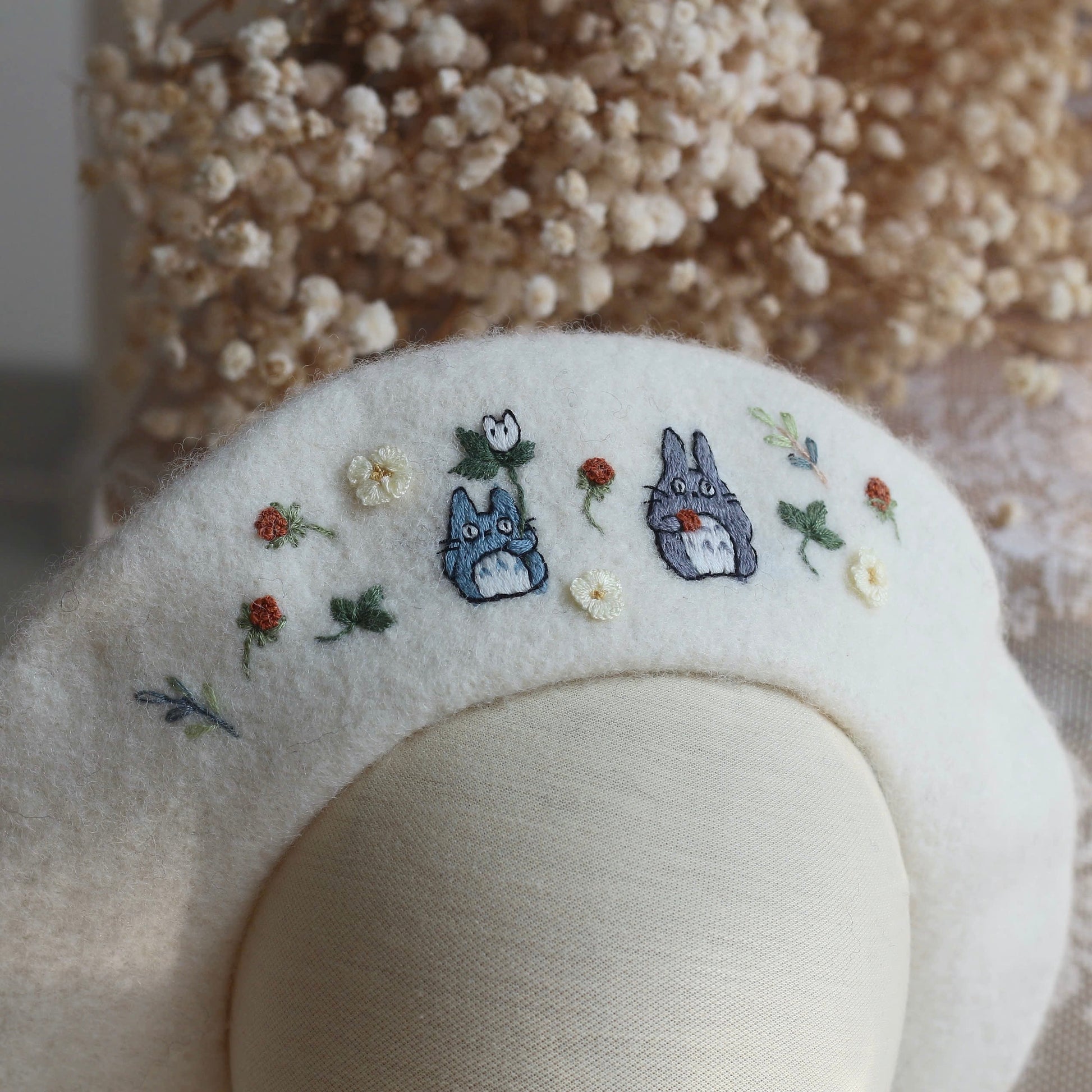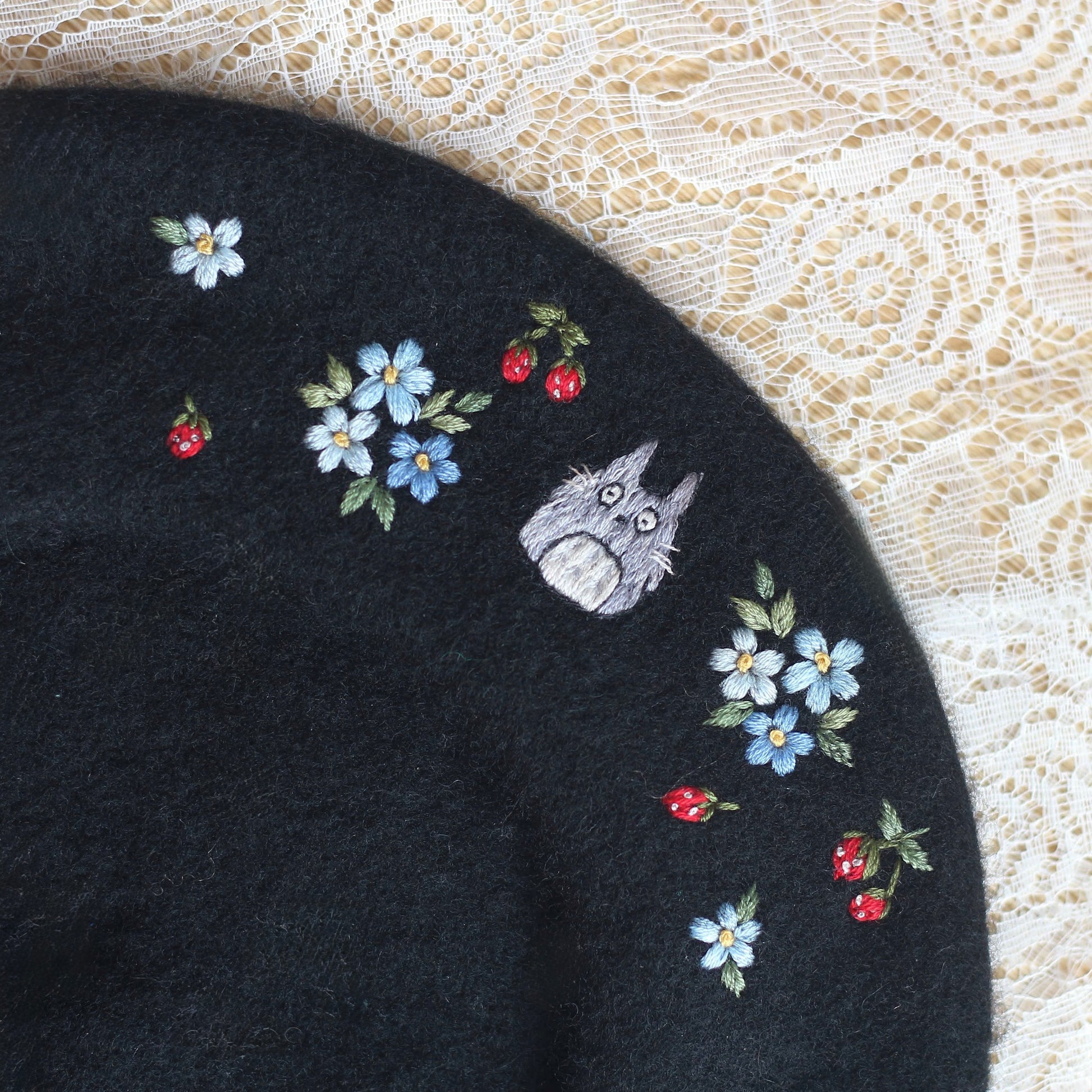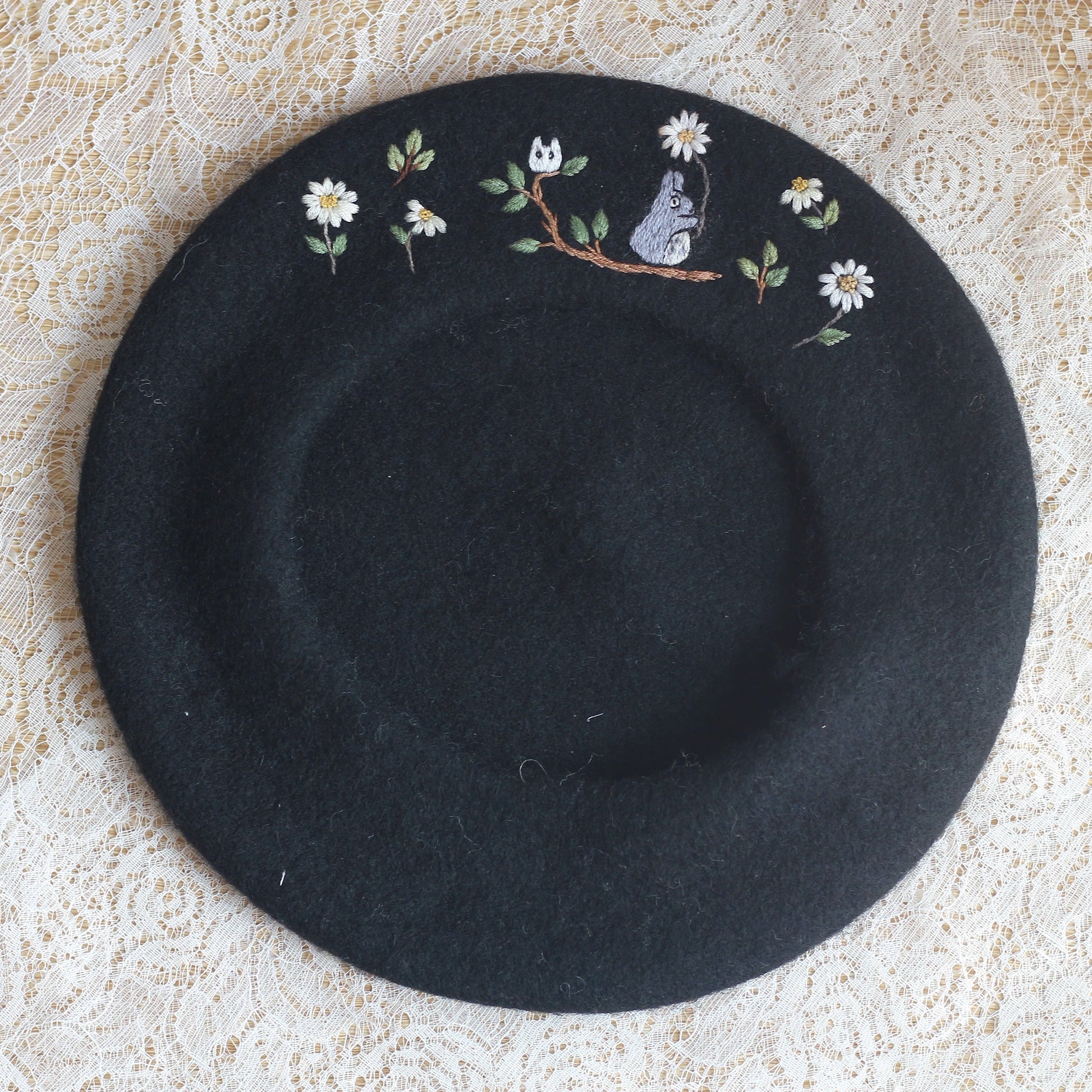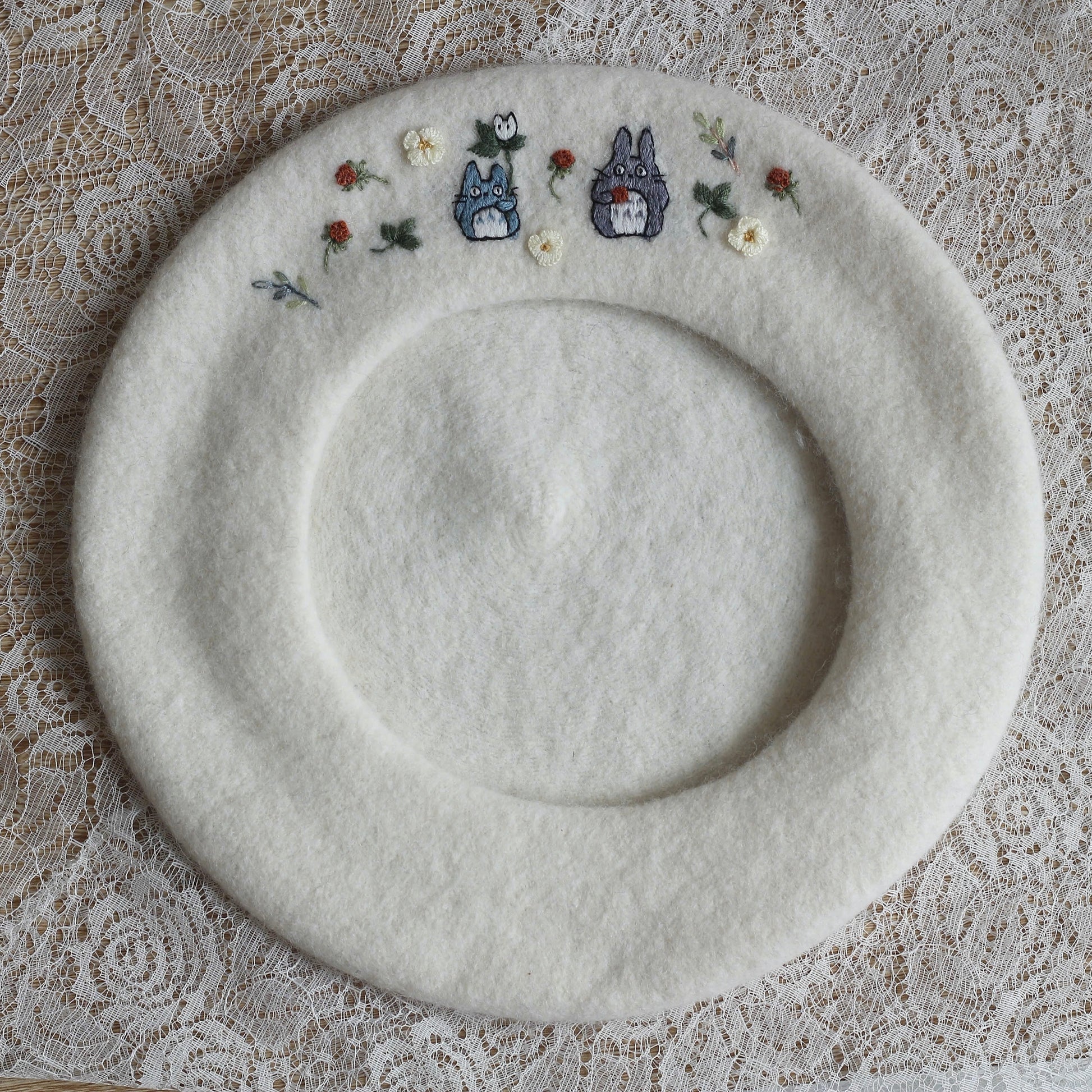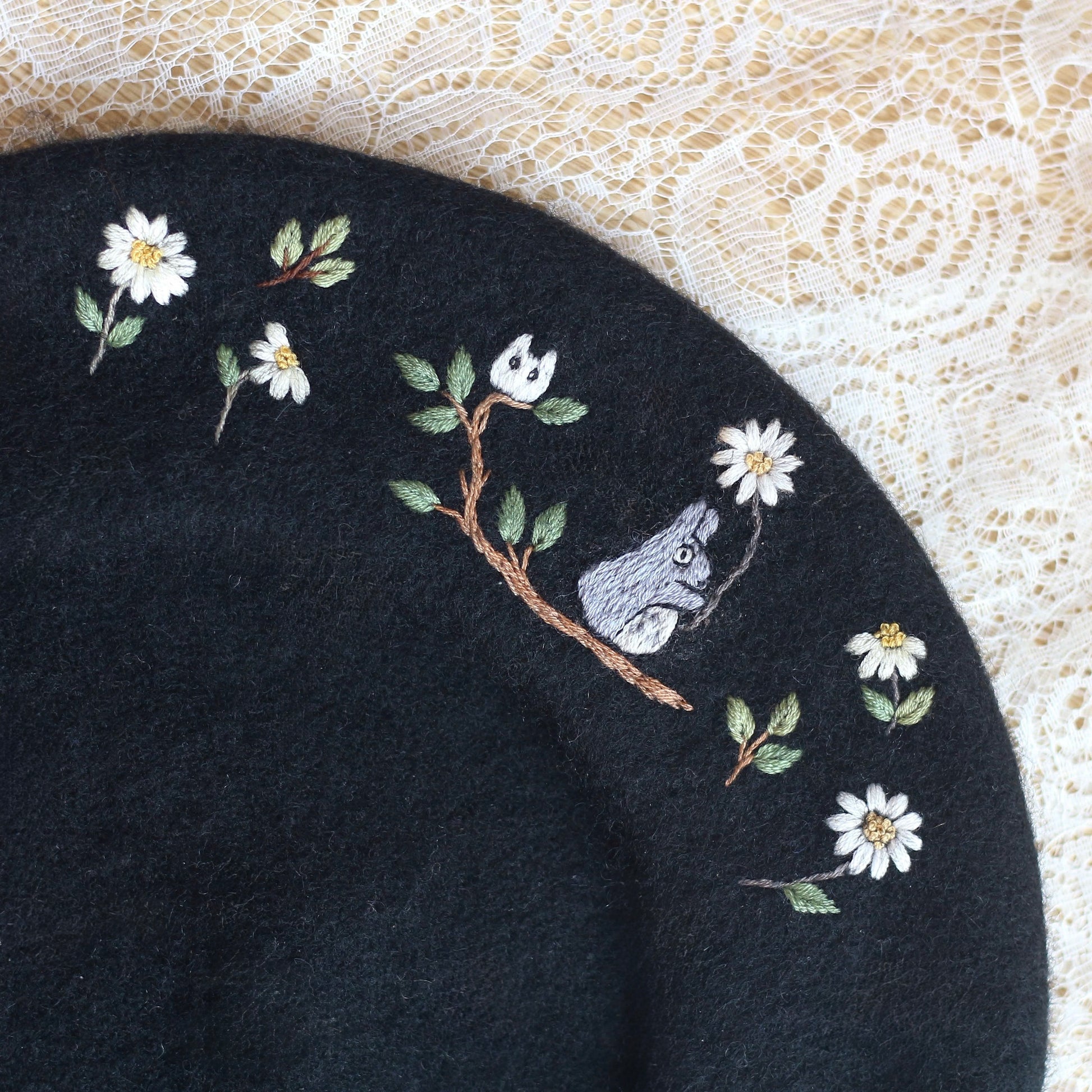 This hand-embroidered beret is more than an accessory, it's a little story made by hand. Made from 100% wool, the beret is patiently embroidered stitch by stitch, taking time, care and intention to shape every detail.