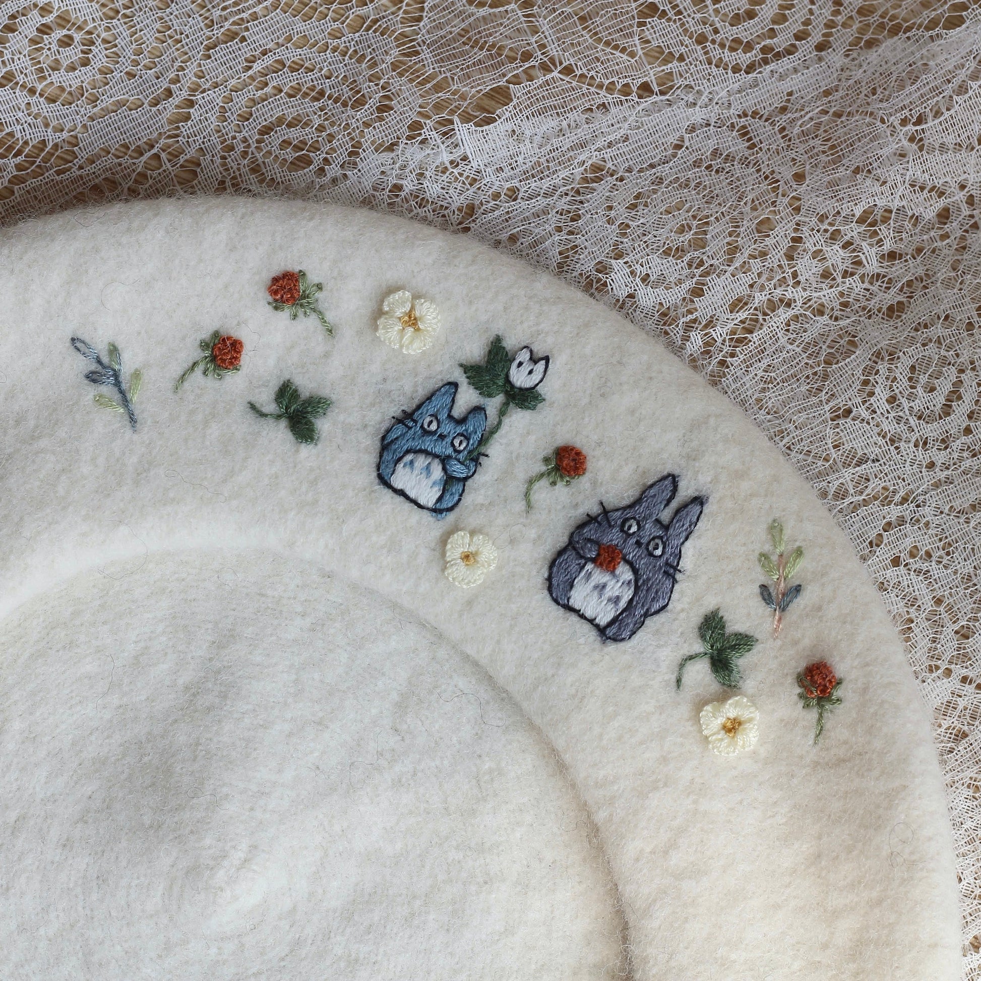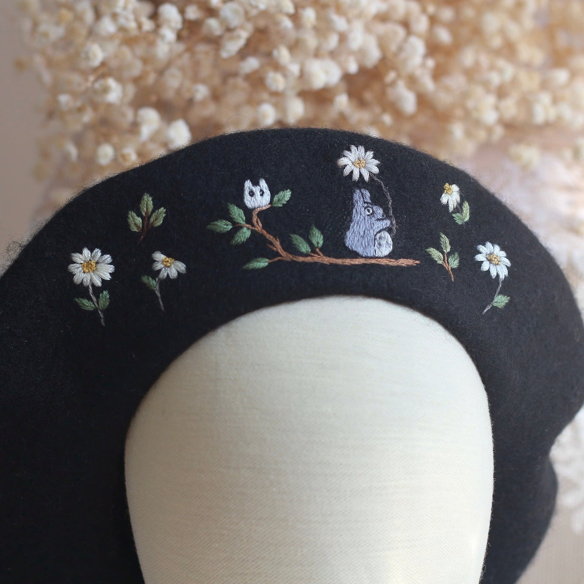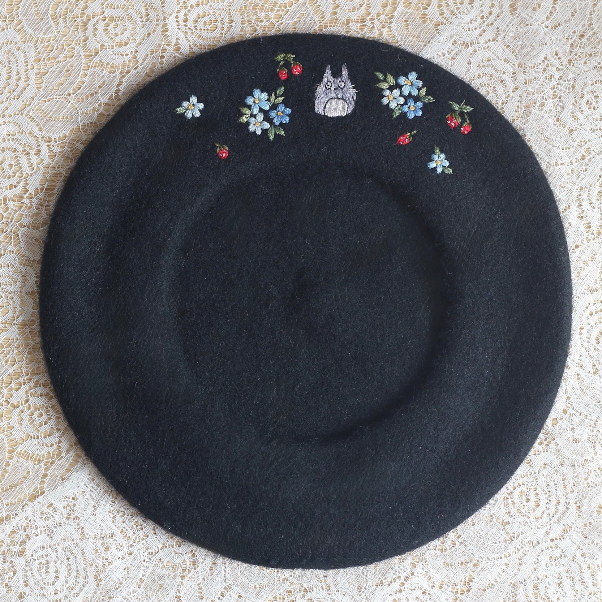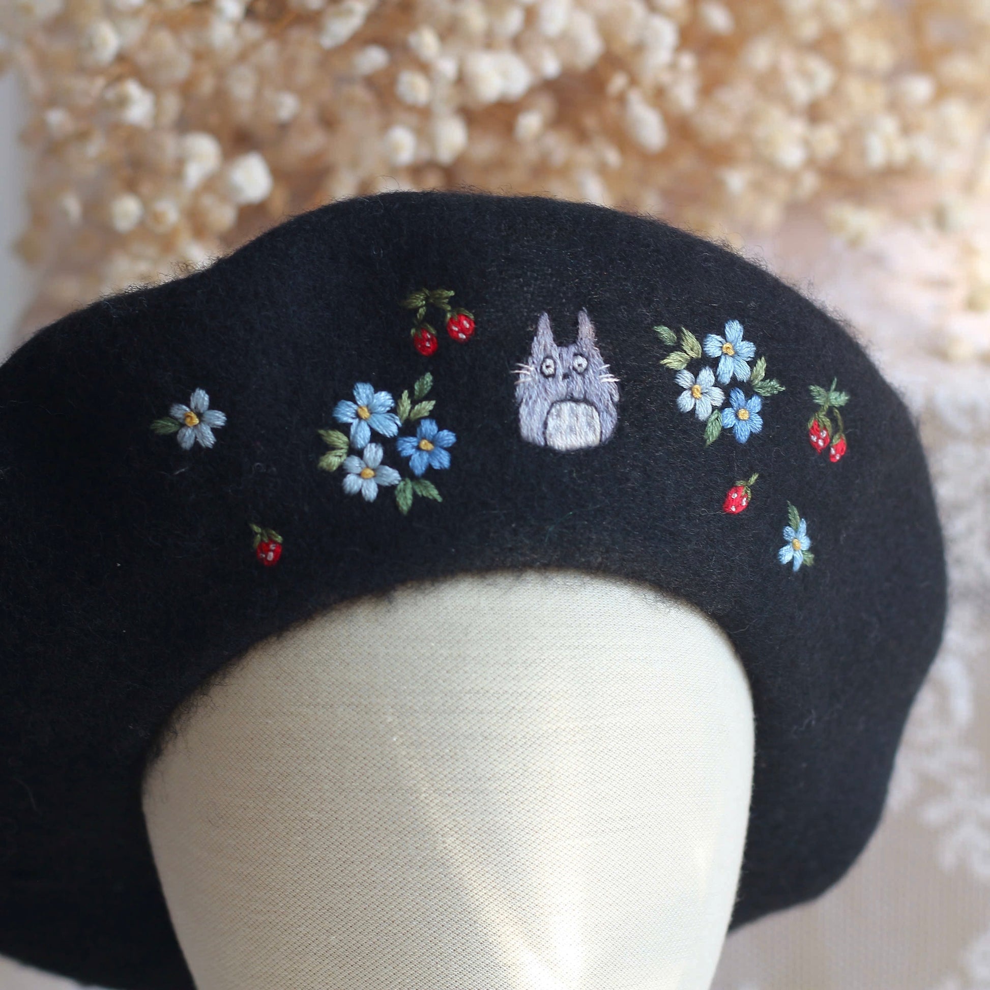 This hand-embroidered beret is more than an accessory, it's a little story made by hand. Made from 100% wool, the beret is patiently embroidered stitch by stitch, taking time, care and intention to shape every detail.