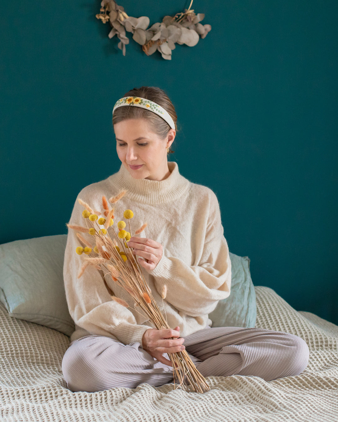This headband, decorated with a delicate embroidered floral pattern, is expertly handcrafted from recycled natural materials. Each piece is unique, as the materials have been given a new life in this beautiful piece of jewelry. The sophisticated embroidery stitches and natural tones create a durable and elegant ensemble. The perfect gift for anyone who values ​​both style and the environment.
