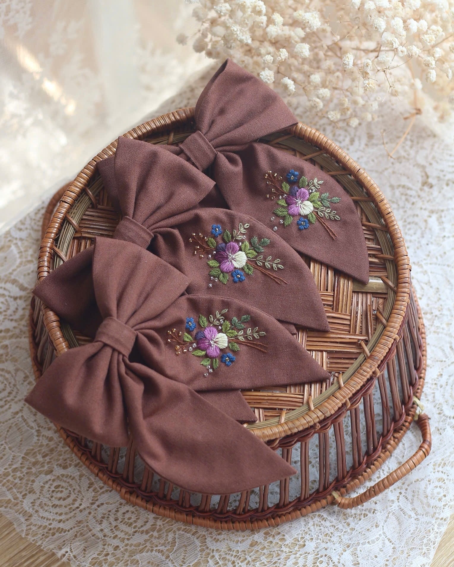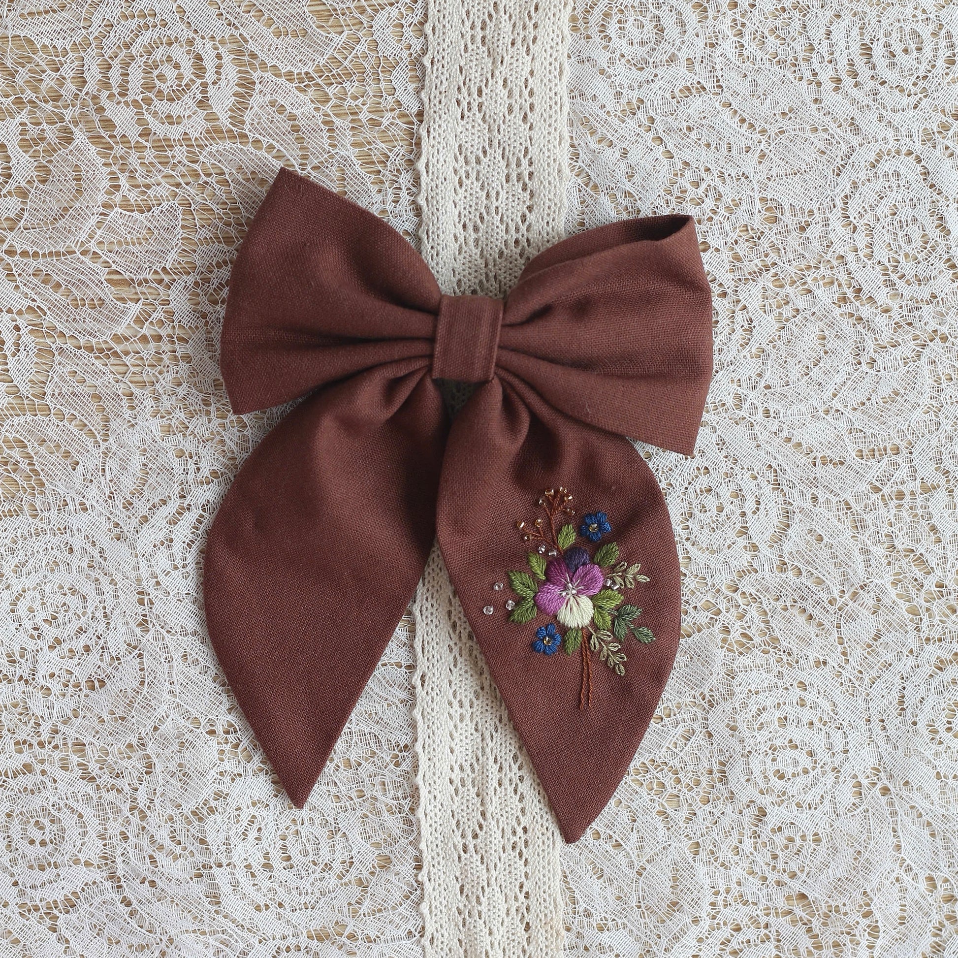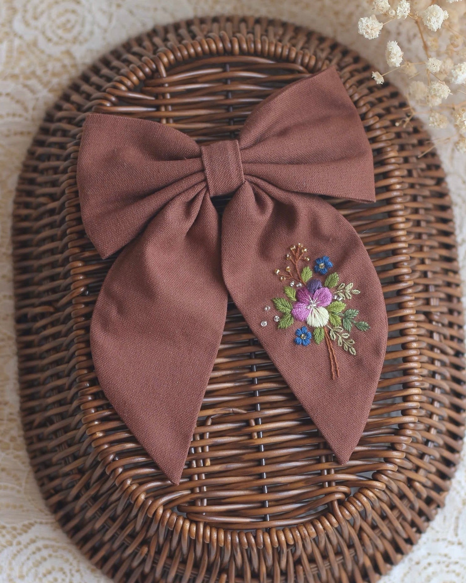 Tämä herkällä kirjotulla kukkakuviolla koristeltu rusetti on taidokkaasti valmistettu käsityönä kierrätetyistä luonnonmateriaaleista. Jokainen yksilö on ainutlaatuinen, sillä materiaalit ovat saaneet uuden elämän tässä kauniissa korussa. Hienostuneet kirjontapistot ja luonnolliset sävyt luovat kestävän ja tyylikkään kokonaisuuden. Täydellinen lahja kaikille, jotka arvostavat sekä tyyliä että ympäristöä.