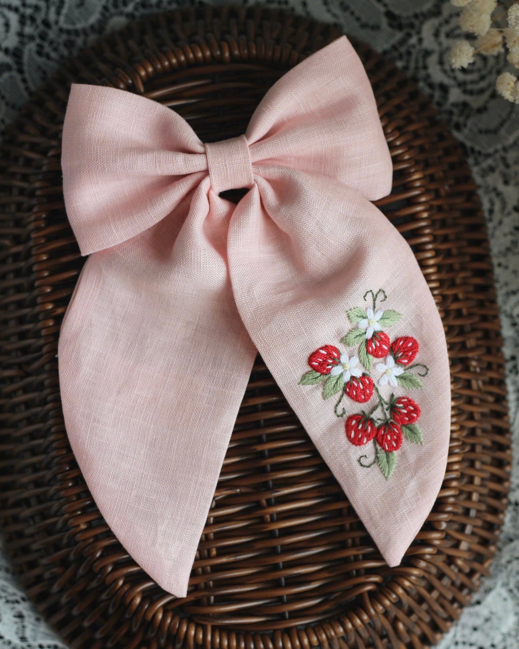 Tämä herkällä kirjotulla mansikkakuviolla koristeltu rusetti on taidokkaasti valmistettu käsityönä kierrätetyistä luonnonmateriaaleista. Jokainen yksilö on ainutlaatuinen, sillä materiaalit ovat saaneet uuden elämän tässä kauniissa korussa. Hienostuneet kirjontapistot ja luonnolliset sävyt luovat kestävän ja tyylikkään kokonaisuuden. Täydellinen lahja kaikille, jotka arvostavat sekä tyyliä että ympäristöä.